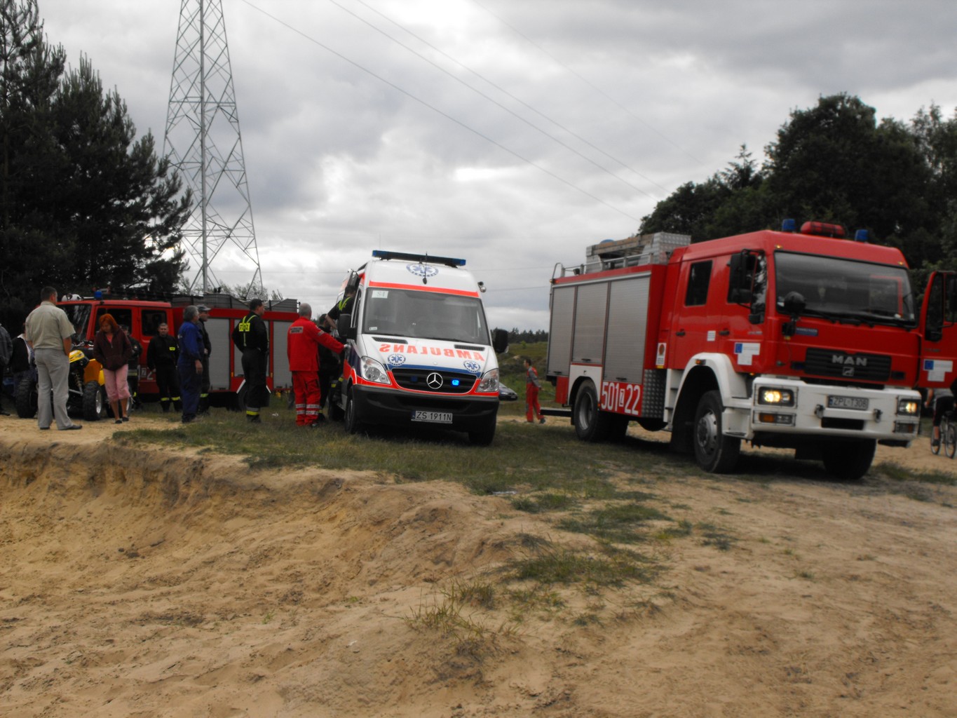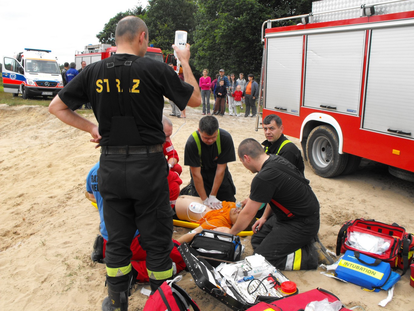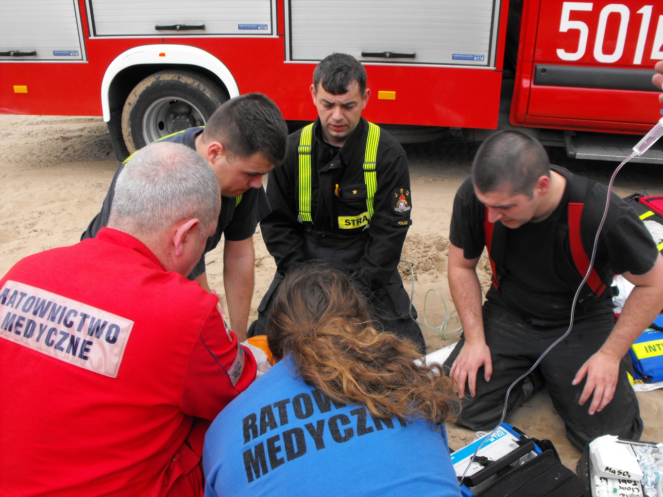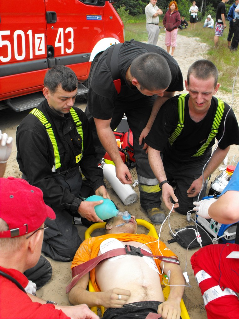 Po około 20 minutach odkopywania, na głębokości około 2 metrów poszkodowany został odnaleziony i wydobyty na powierzchnię. Po stwierdzeniu braku czynności życiowych (oddech, tętno) we współpracy z pogotowiem ratunkowym strażacy przystąpili do resuscytacji krążeniowo-oddechowej. Po około 20 minutach poszkodowany odzyskał tętno i wentylowany przy pomocy worka samorozprężalnego został przewieziony karetką pogotowia do szpitala w Policach.