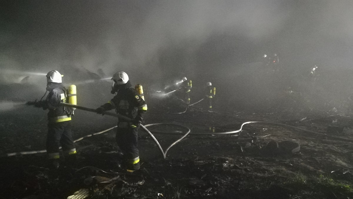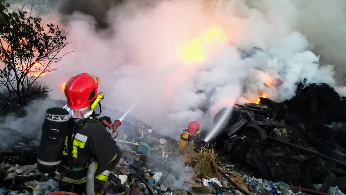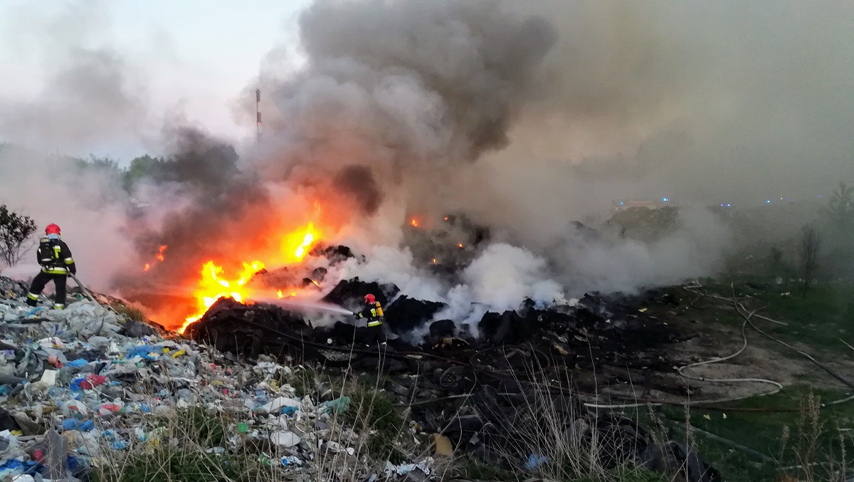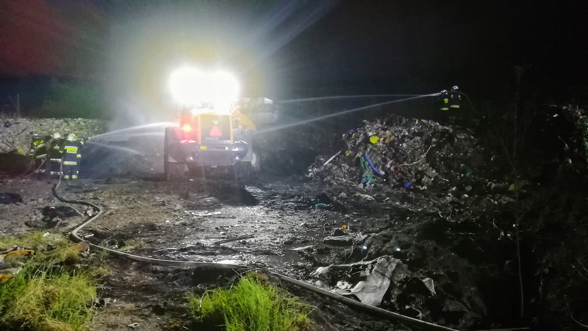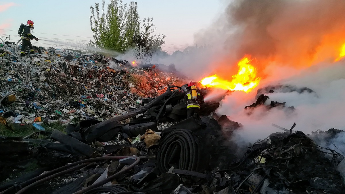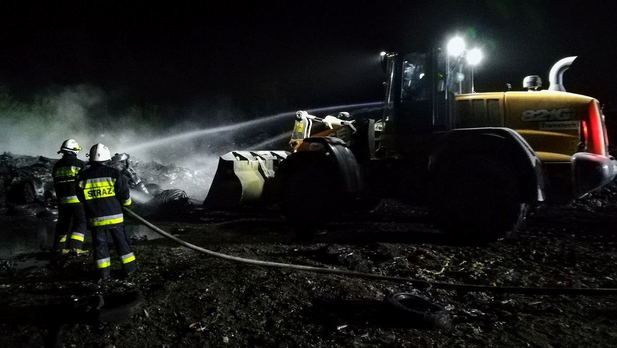 Głównie paliły się tworzywa sztuczne w tym folie, styropiany, gumy syntetyczne oraz trawa. Ze względy na dynamikę rozprzestrzeniania się pożaru i wielkość sukcesywnie na polecenie kierującego działaniem ratowniczym dysponowano kolejne zastępy straży pożarnej. Ponadto skierowano z dyżurów domowych strażaków do działań na miejscu zdarzenia oraz wzmacniając stanowisko kierowania. Działania były mocno utrudnione ze względu na zmienny kierunek wiatru oraz niewielką jego prędkość, co skutkowało bardzo dużym zadymieniem w miejscu prowadzonych działań. W związku z powyższym strażacy pracowali w pełnym zabezpieczeniu dróg oddechowych. Na bieżąco roty podmieniano z zachowaniem odpoczynku dla strażaków, którzy działali bezpośrednio przy gaszeniu. Podano łącznie 8 prądów gaśniczych w natarciu oskrzydlającym na palące się odpady. W trakcie działań zorganizowano w siedzibie Jednostki Ratowniczo-Gaśniczej punkt ciągłego ładowania butli z powietrzem oraz dostarczania na miejsce prowadzonych działań. Zaopatrzenie wody do gaszenia na miejsce akcji polegało na dowożeniu ze względu na brak hydrantów zewnętrznych i zbiorników wody na terenie składowiska. W tym celu zorganizowano bieżący punkt pobory wody z hydrantów zlokalizowanych na terenie Zakładowej Straży Pożarnej.