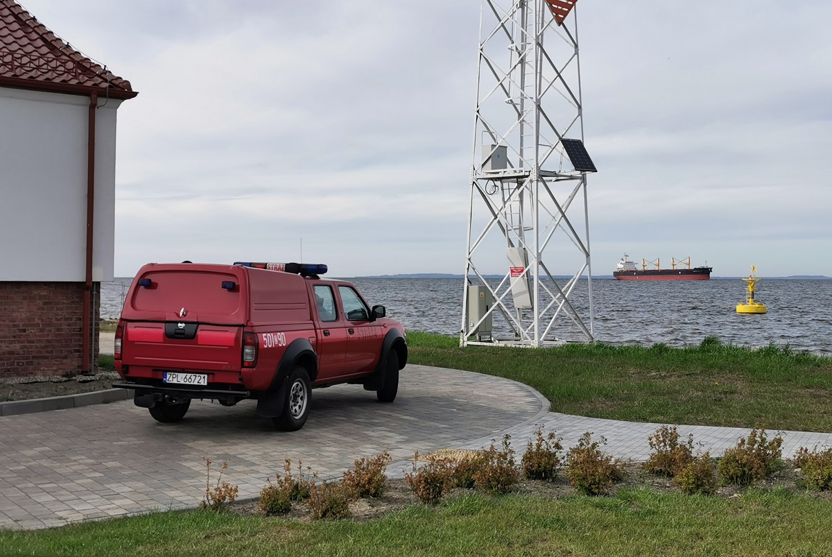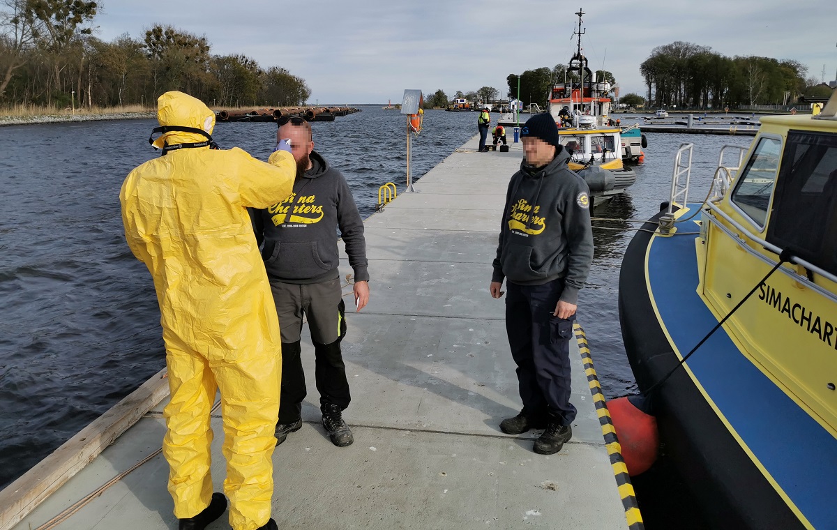 Strażacy również sprawdzali temperaturę u osób przypływających do portu w Trzebieży.