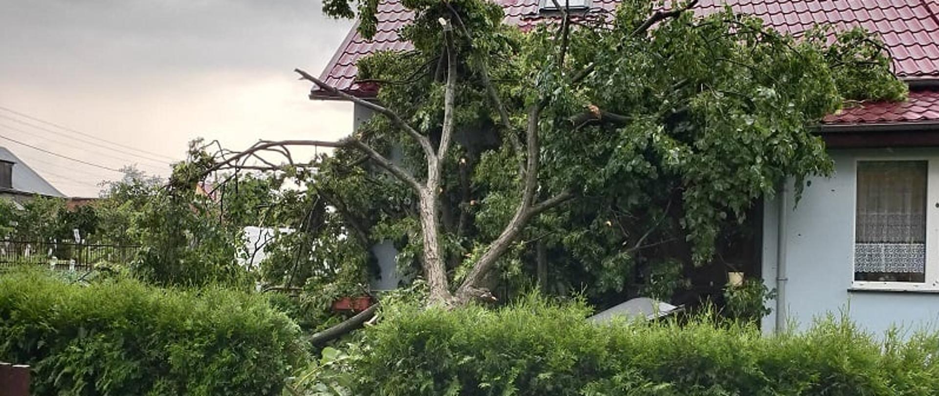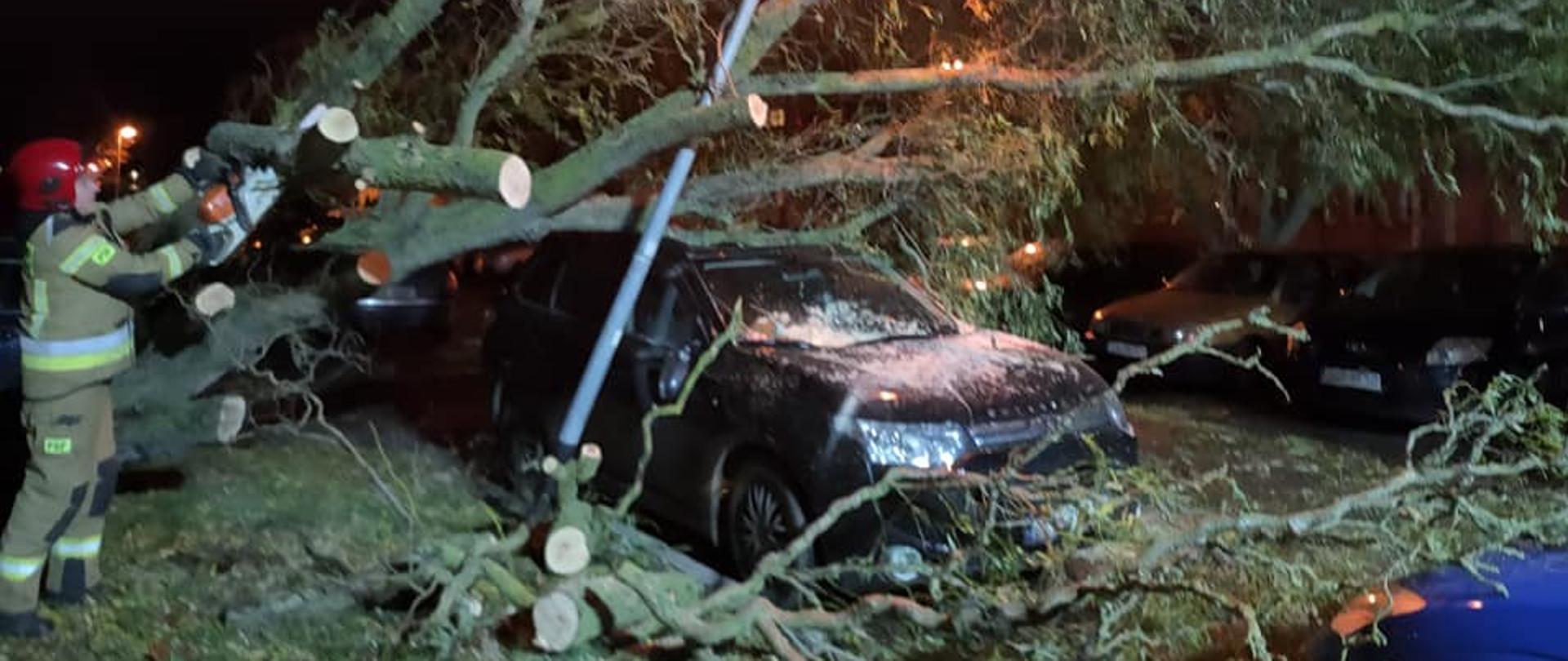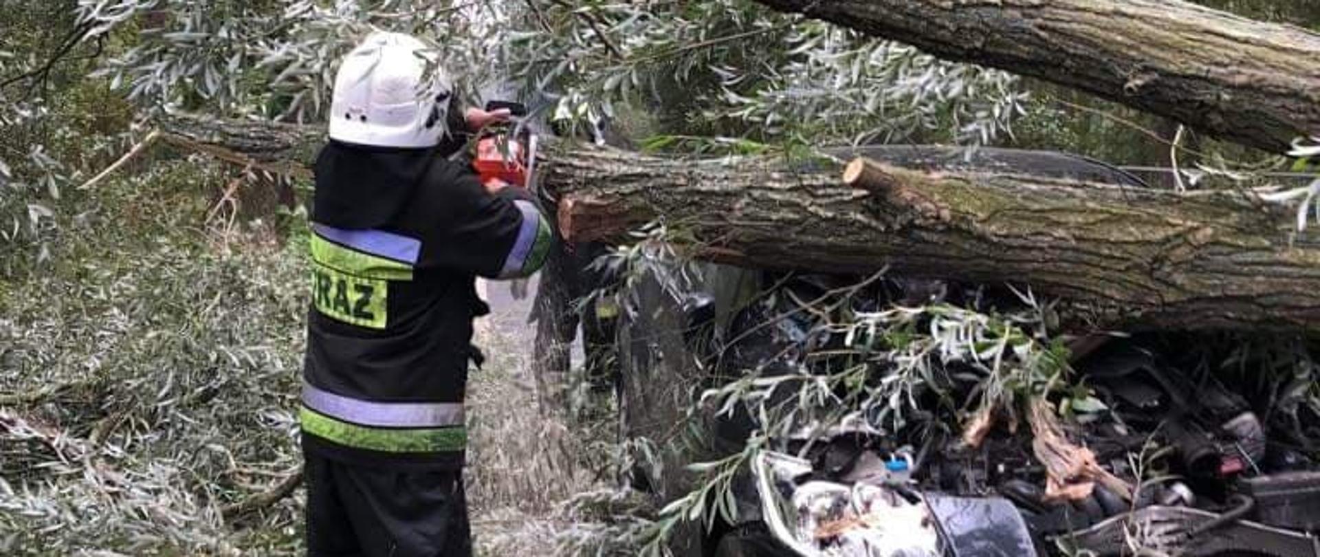 Odłamane konary drzewa spadły na jezdnię i przejeżdżający samochód