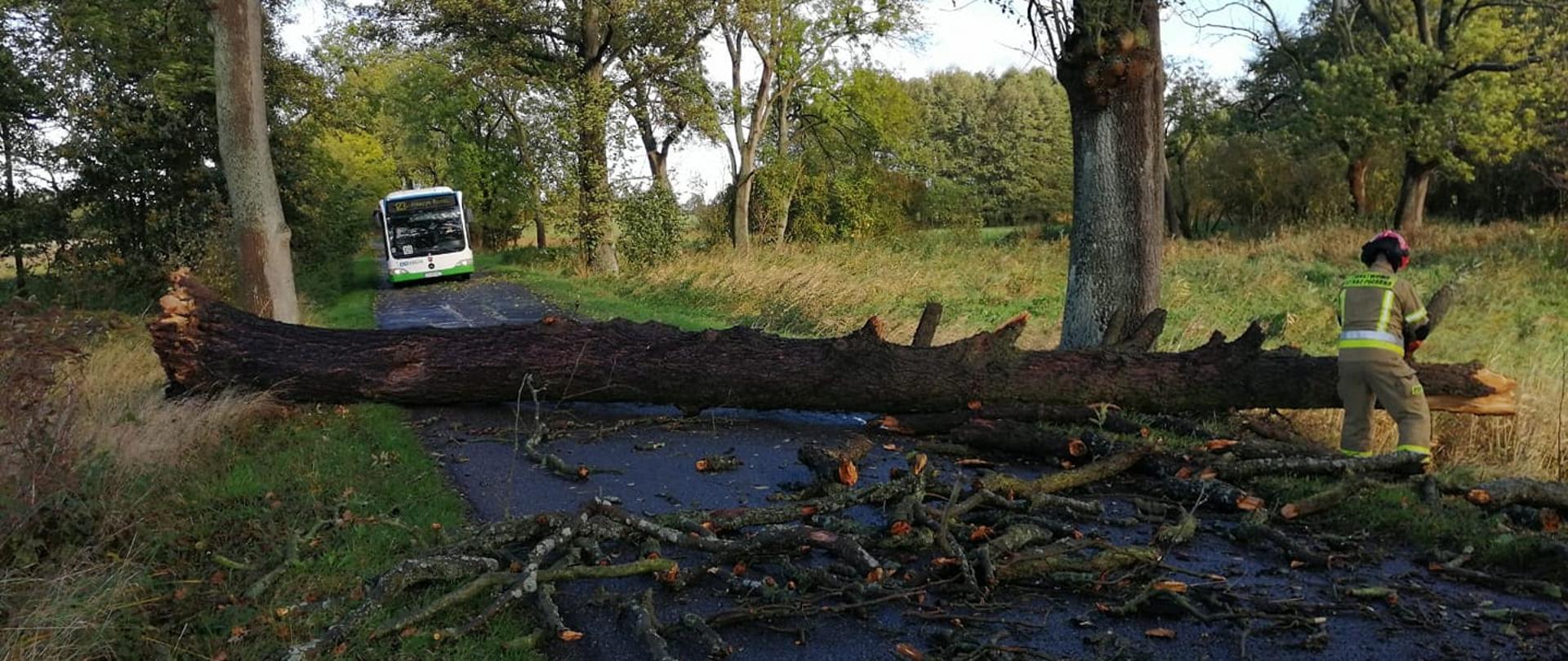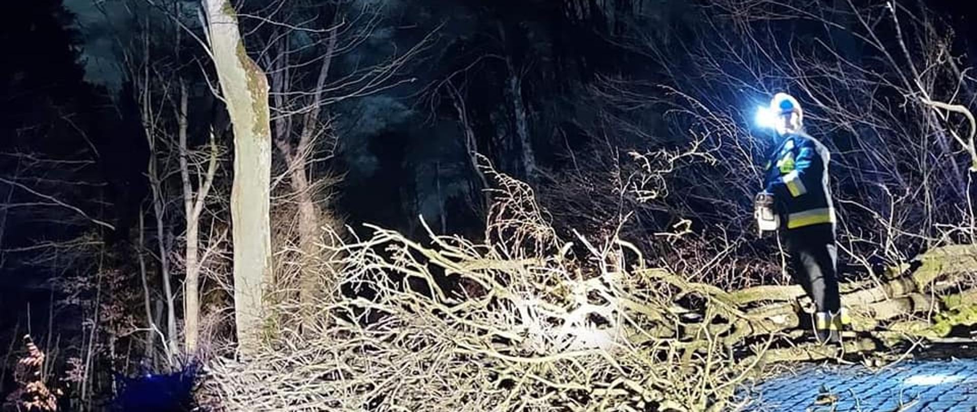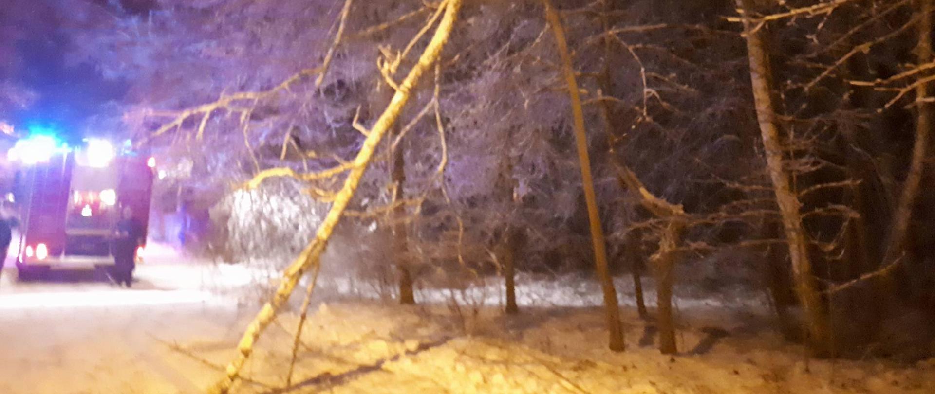 Odłamane konary drzewa spadły na jezdnię i przejeżdżający samochód