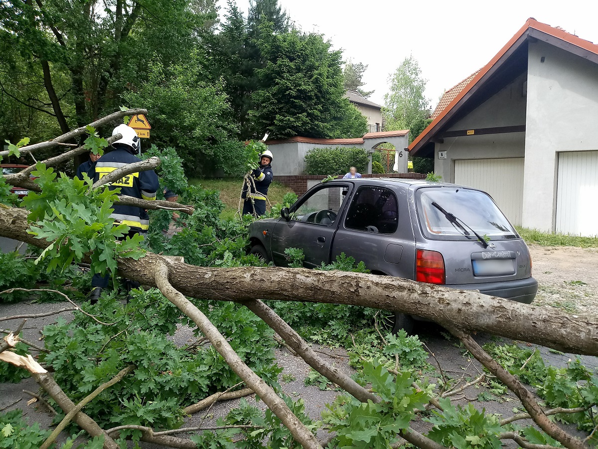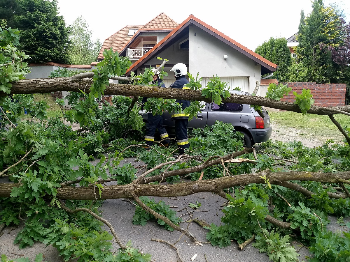 Dzisiaj w południe na terenie powiatu polickiego były dwie interwencje straży pożarnej do powalonych drzew. Pierwsze zdarzenie dotyczyło wiatrołomu na jezdni ulicy Emilii Plater w Policach, do którego zadysponowano zastęp z JRG Police, natomiast drugie dotyczyły odłamaniu się części drzewa na ulicę Szkolną w Bezrzeczu, wskutek którego jeden konar uderzył w przejeżdżający samochód osobowy.