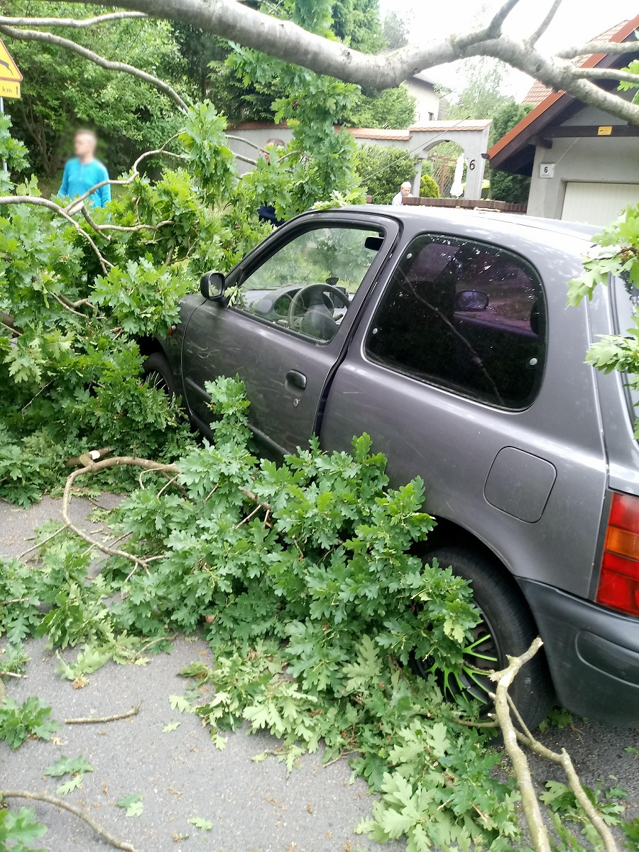 W pojeździe podróżowała kobieta z synem – na szczęście nikt nie odniósł obrażeń. Ze względu na zagrożenie odłamaniem pozostałych rozwidleń drzewa na jezdnię zadysponowano na miejsce drabinę mechaniczną. Na miejscu działał zastęp z OSP Dobra oraz drabina mechaniczna z JRG nr 5 ze Szczecina. Usuwanie miejscowego zagrożenia trwało 2 godz. 15 minut.