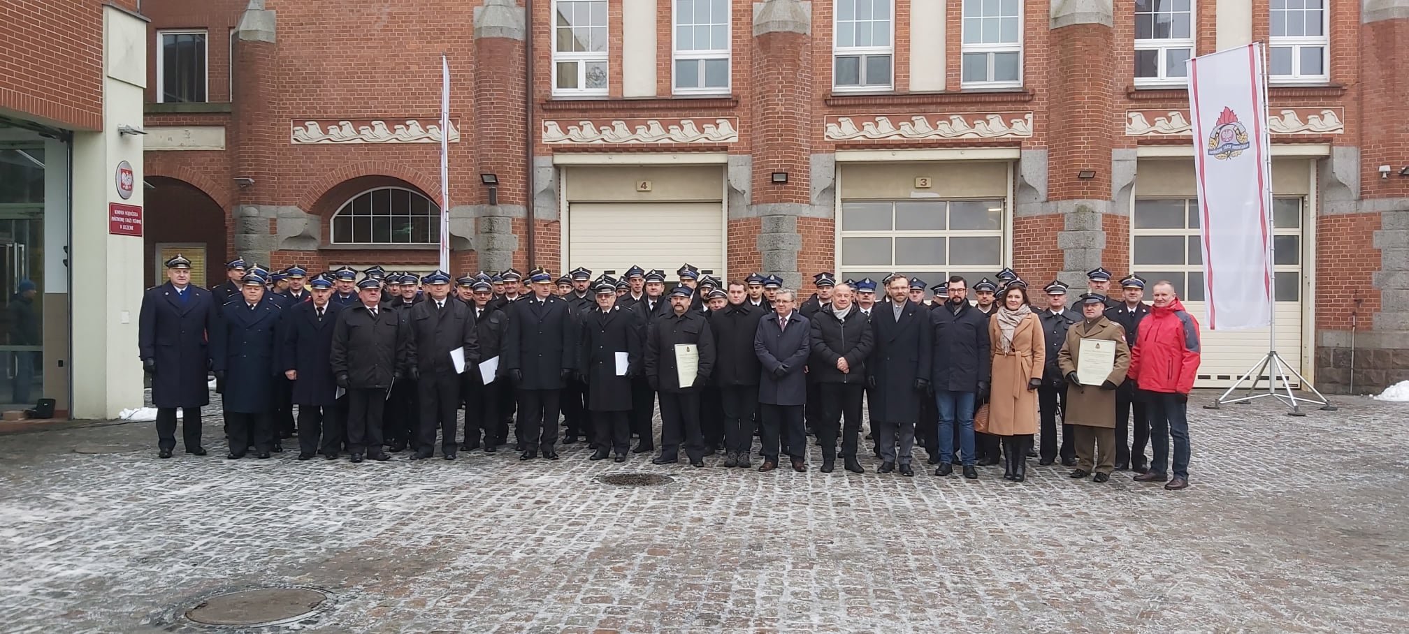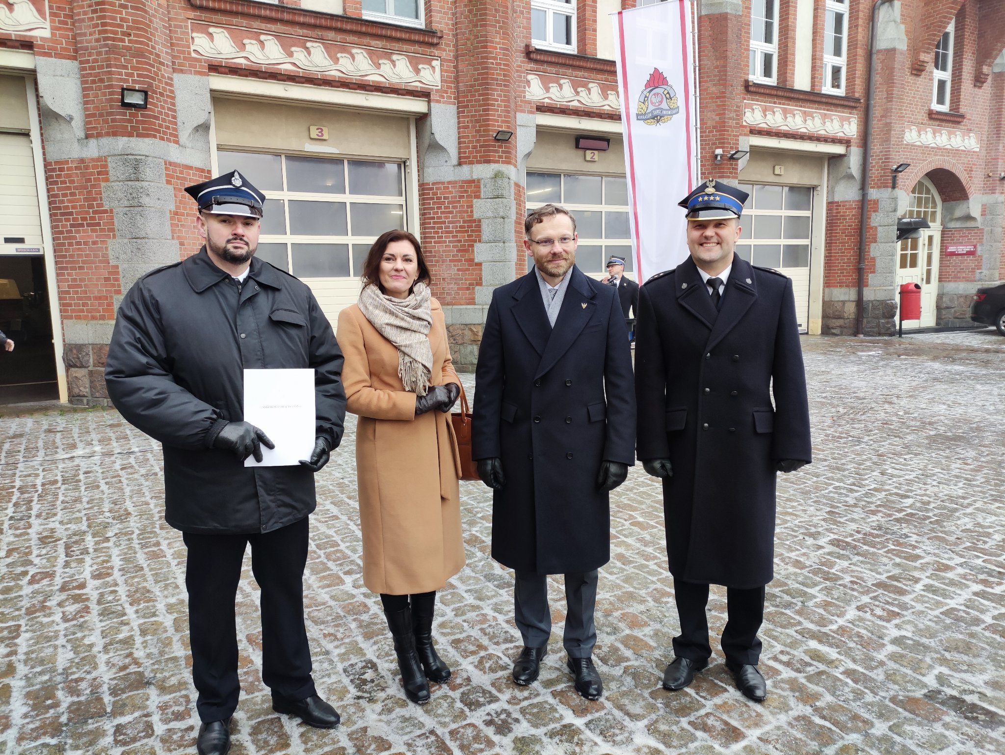 Na placu Komendy Wojewódzkiej PSP w Szczecinie prezes Ochotniczej Straży Pożarnej w Trzebieży dh Grzegorz Miśkiw odebrał z rąk Wojewody Zachodniopomorskiego Zbigniewa Boguckiego umowę o dofinansowanie w kwocie 1 mln 270 tys. zł za zajęcie pierwszego miejsca w Polsce w akcji #SzczepimysięzOSP.