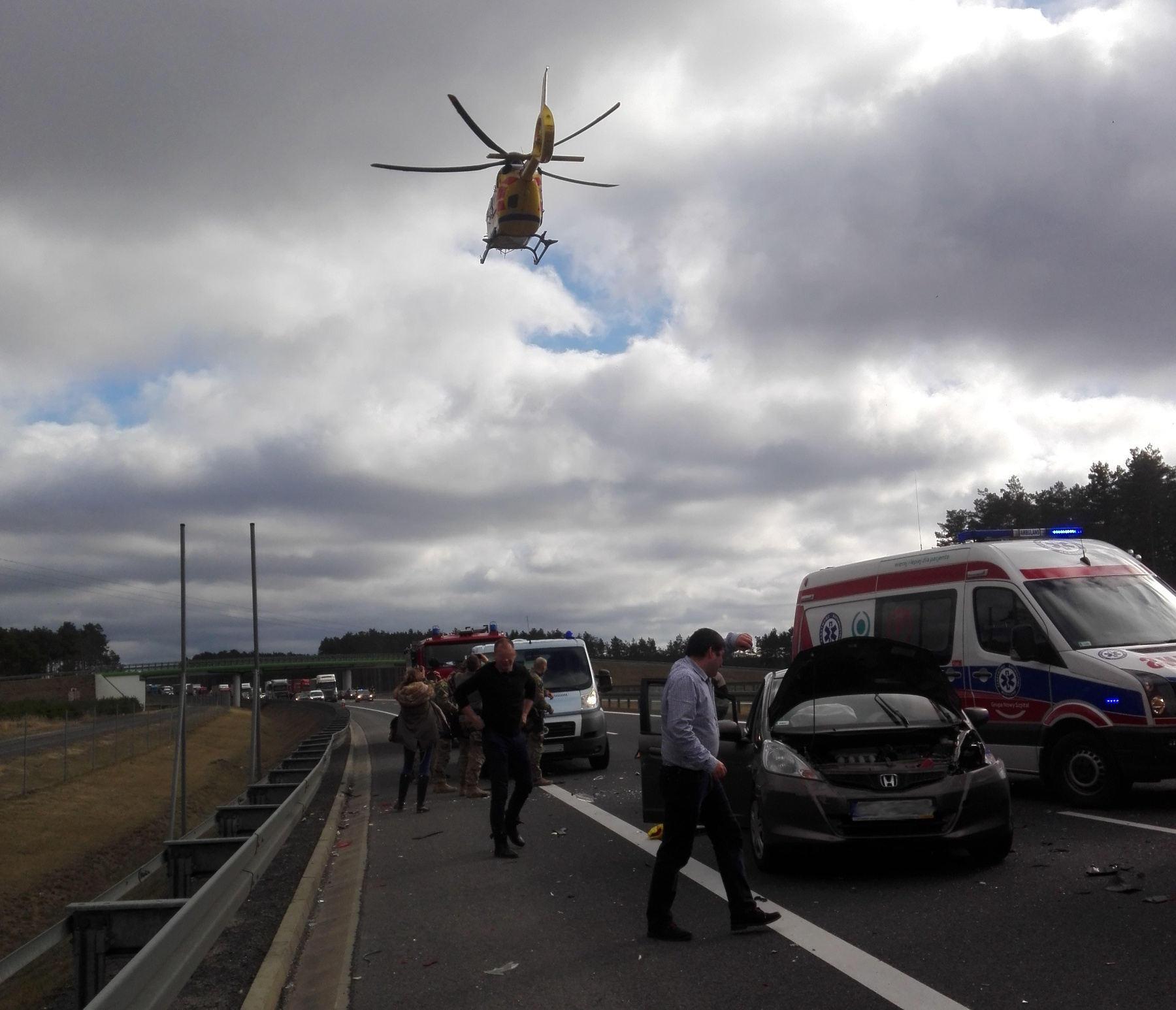 Podczas powrotu ze Szkoły Aspirantów Państwowej Straży Pożarnej w Poznaniu, około godz. 12.20 jadąc trasą S3 na wysokości Trzebiszewa, w kierunku Gorzowa, funkcjonariusz naszej Komendy mł. ogn. Paweł Blachura wraz z kolegami z Komendy Miejskiej PSP ze Szczecina natrafili na wypadek drogowy. W zderzeniu uczestniczyły dwa pojazdy. Strażacy zatrzymali się i po dokonaniu rozpoznania rozpoczęli udzielanie pomocy leżącej na drodze kobiecie. Z wykształcenia ratownik medyczny mł ogn. Paweł Blachura wraz z drugim strażakiem ułożyli kobietę na plecach i sprawdzili podstawowe parametry życiowe. W trakcie przeprowadzania wstępnego badania urazowego na miejsce zdarzenia dojechał nieoznakowanym pojazdem Pododdział Policji Sekcji Antyterrorystycznej KWP w Gorzowie Wielkopolskim. Funkcjonariusze wsparli strażaków w opiece nad poszkodowaną. Policjanci w pojeździe na wyposażeniu posiadali torbę medyczną R1. Dzięki temu można było podać tlen oraz zapewnić komfort termiczny poszkodowanej przy użyciu foli życia. W międzyczasie inni strażacy powiadomili właściwą jednostkę PSP o rodzaju wypadku, dokładnym miejscu zdarzenia oraz ogólnym stanie kobiety, zabezpieczyli miejsce wypadku - wyciągnęli kluczyki ze stacyjki, odłączyli akumulator oraz gestami informowali nadjeżdżające pojazdy o zaistniałym niebezpieczeństwie.