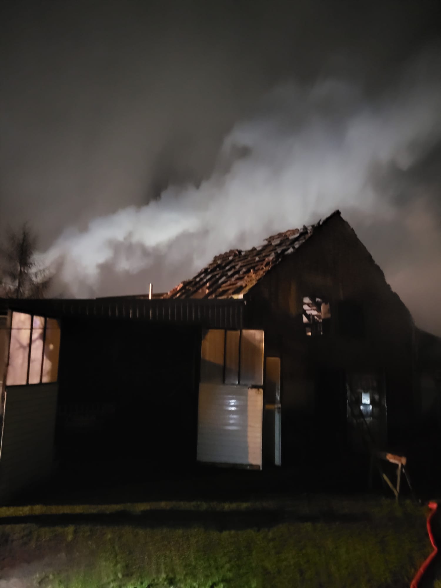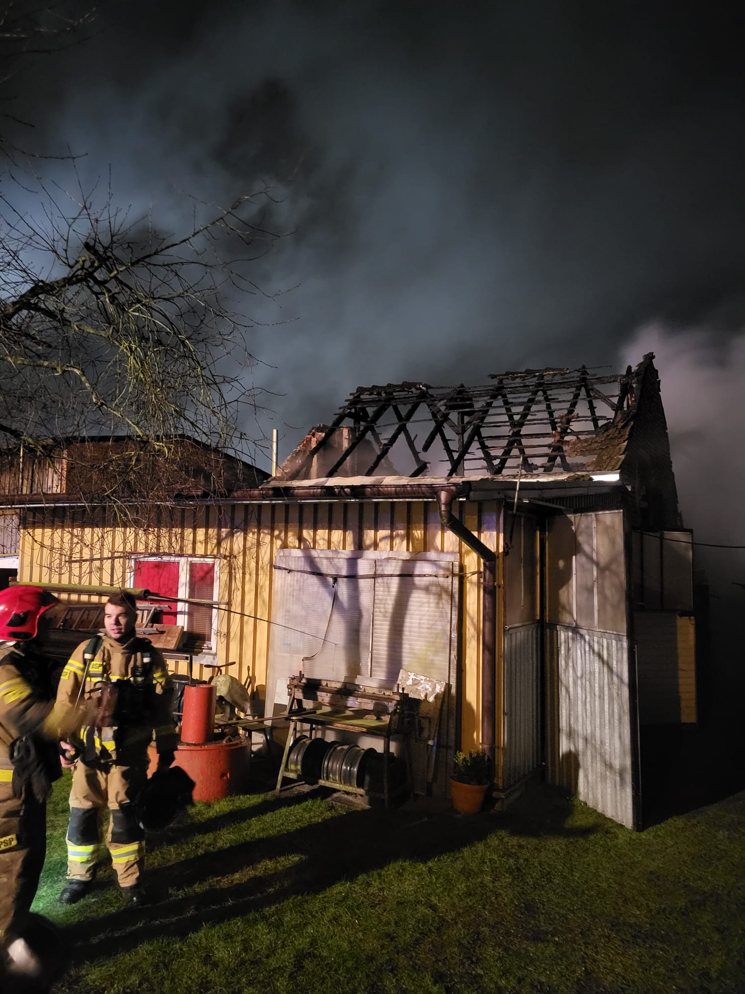 Przed godziną 4. otrzymaliśmy informację o pożarze budynku gospodarczego wraz z garażem oraz drewnianą wiatą. Po dotarciu na miejsce zdarzenia, strażacy podali trzy prądy gaśnicze wody na palące się budynki oraz dwa w obronie na drewnianą stodołę znajdującą się na sąsiedniej posesji. W trakcie prowadzonej akcji gaśniczej ewakuowano z garażu samochód terenowy oraz usunięto kanister z paliwem i butle z gazem propan-butan, z których jedna uległa wcześniej rozszczelnieniu.