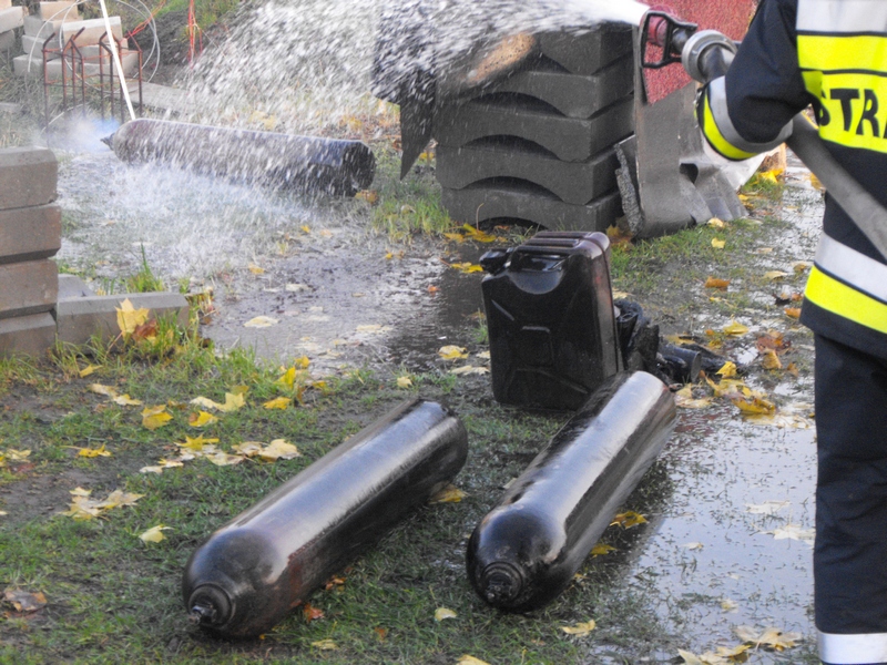 Po przyjeździe na miejsce strażaków stwierdzono, że w palącym się budynku są butle z gazem. Z jednej butli palił się gaz, który wydobywał się poprzez uszkodzony zawór. Działania ratowników polegały na podaniu prądu gaśniczego na butle w celu ich schłodzenia oraz podaniu dwóch prądów do palącego się pomieszczeniu. Gdy opanowano rozprzestrzenianie się pożaru wyciągnięto butle z budynku. Działania gaśnicze trwały 3 godziny.