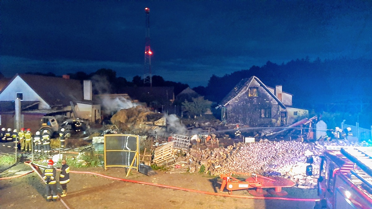 Na miejsce w pierwszym rzucie zadysponowano 5 zastępów gaśniczych straży pożarnej w tym cysternę z wodą. Po przybyciu na miejsce zdarzenia strażacy zastali rozwinięty pożar podpiwniczonej stodoły, która znajdowała się po środku gospodarstwa agroturystycznego oraz objęte płomieniami pobliskie trzy budynki mieszkalne. Przed przybyciem straży pożarnej wszyscy domownicy ewakuowali się z obiektów mieszkalnych - łącznie 9 osób.