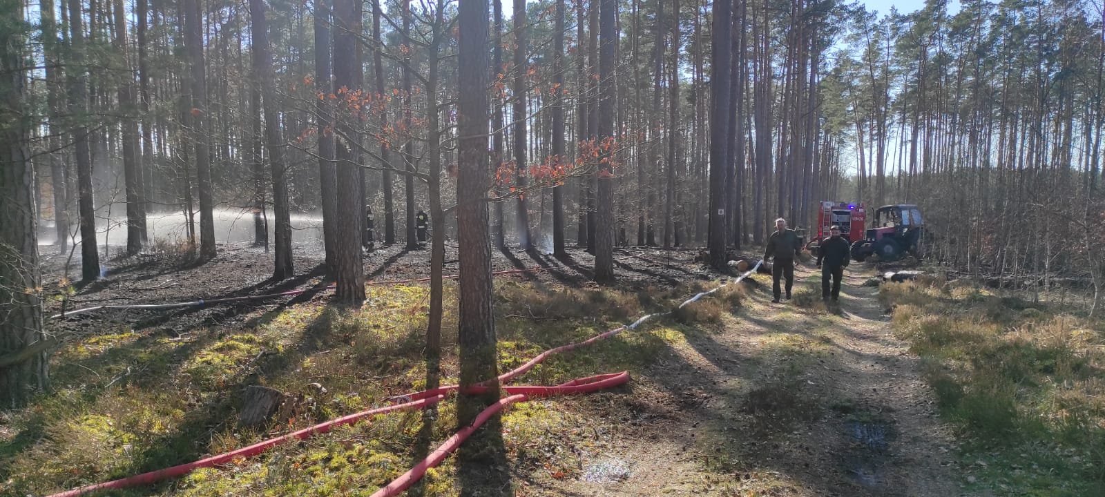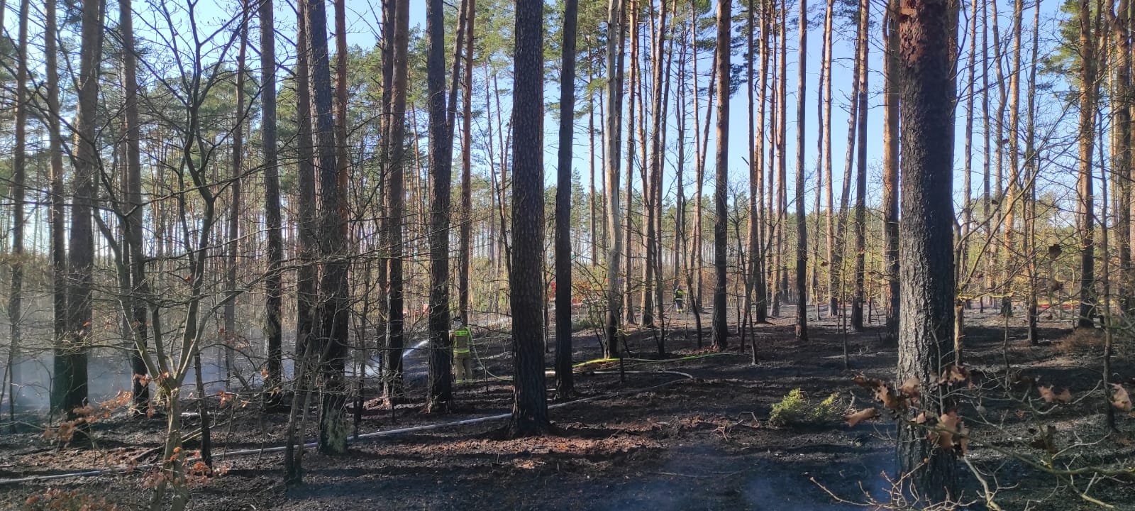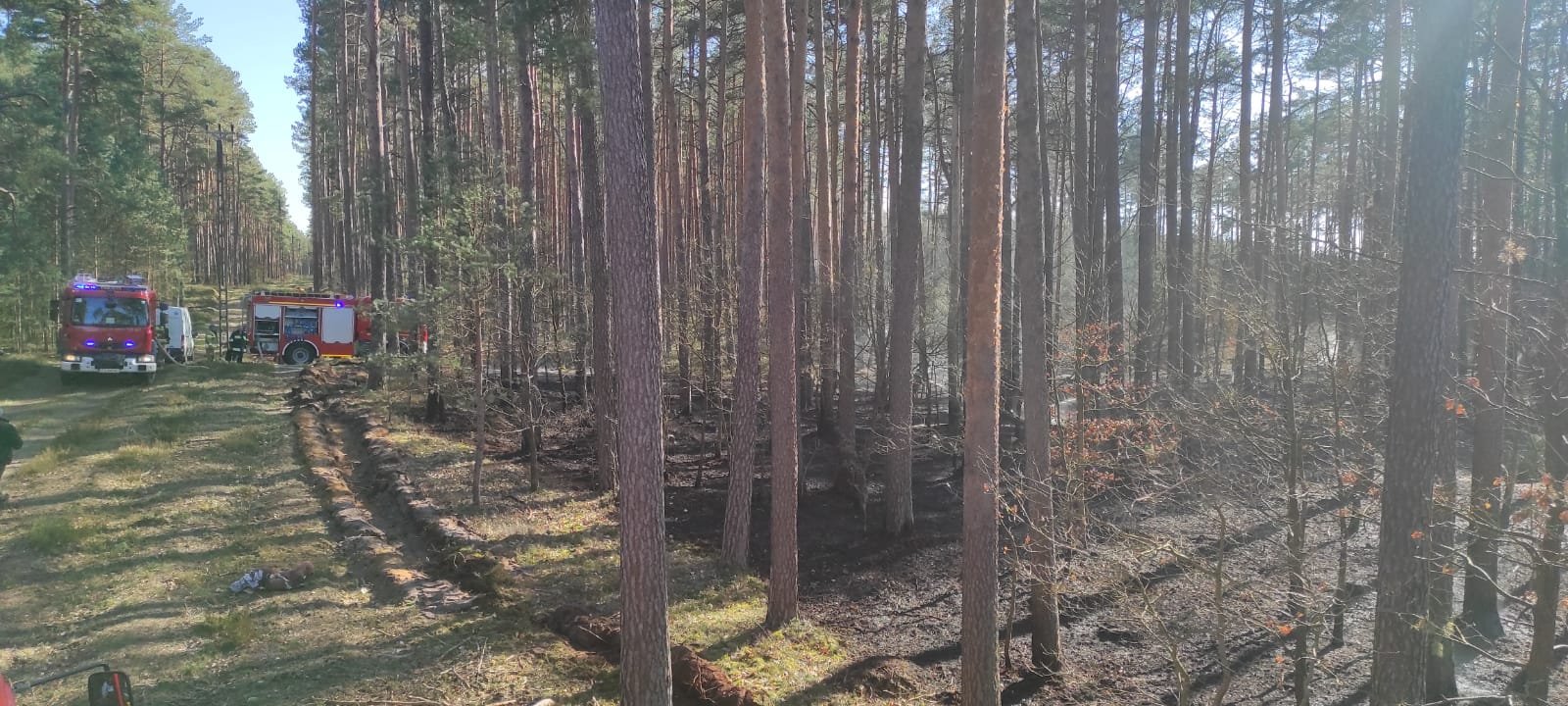 z JRG Police, OSP Trzebież, OSP Police, OSP Tanowo, OSP Brzózki i OSP Nowe Warpno, łącznie 34. strażaków oraz 4 pojazdy i 8. pracowników Nadleśnictwa Trzebież.