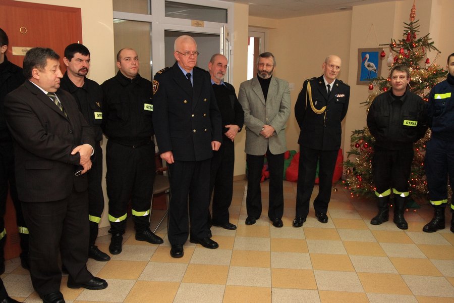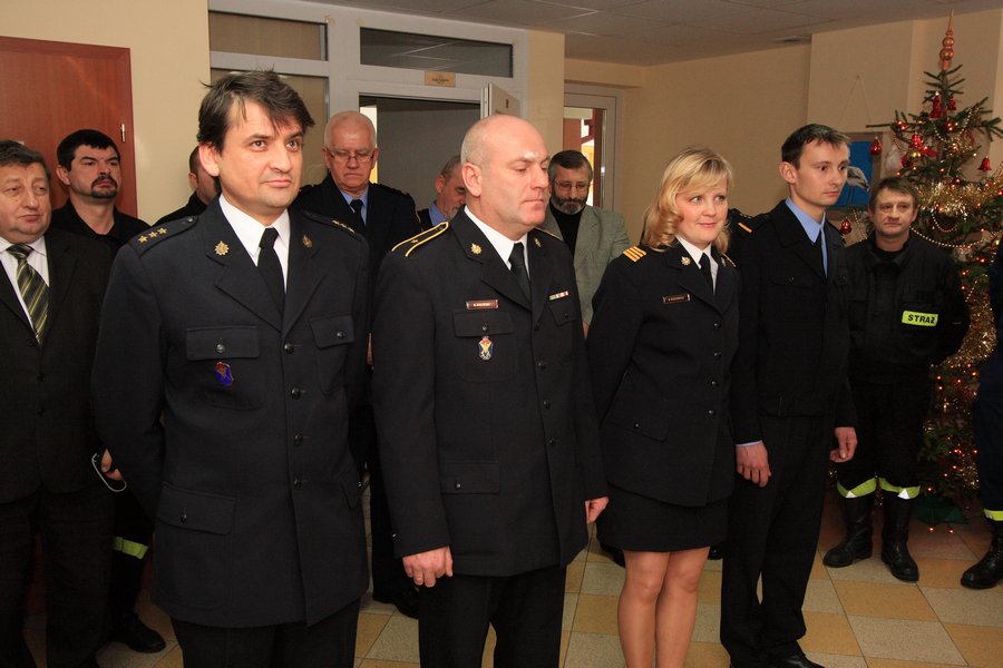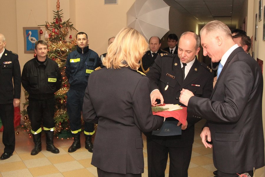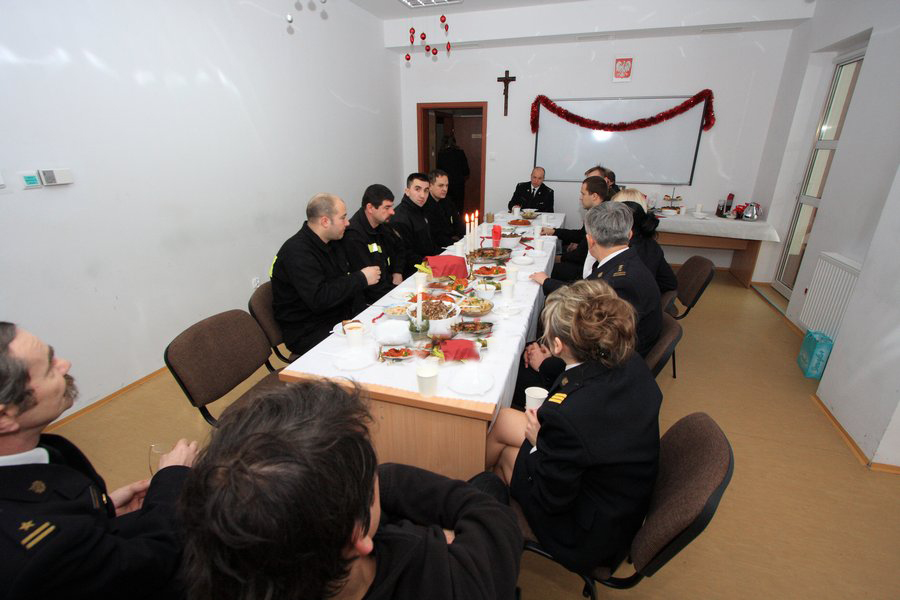 Uroczystą Wigilię zapoczątkowało powitanie gości przez Komendanta Powiatowego PSP w Policach - bryg. Dariusza Uchto, który podziękował gościom za przybycie, a swoim pracownikom za oddaną służbę, która w tych czasach nie jest łatwa. Komendant Dariusz Uchto wspólnie z Panem Starostą w imieniu Komendanta Wojewódzkiego st. bryg. Henryka Cegiełki wręczyli czterem funkcjonariuszom przyznane nagrody pieniężne. Następnie głos zabrał Pan Starosta Leszek Guździoł, który podziękował za dotychczasową służbę i współpracę. Ksiądz dziekan wygłosił Słowo Boże, które nawiązywało do Narodzenia Pańskiego. Żeby tradycji stała się zadość wszyscy zebrani podzielili się opłatkiem i składali sobie najserdeczniejsze życzenia, następnie "zasiedli" do stołów, by w typowo rodzinnej atmosferze powspominać mijający rok w KP PSP oraz porozmawiać o planach na przyszłość. Następne spotkanie opłatkowe za rok.