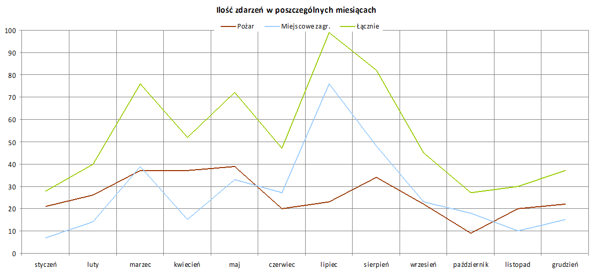 - największą liczbę pożarów odnotowano w maju (39), a miejscowych zagrożeń w lipcu (27);