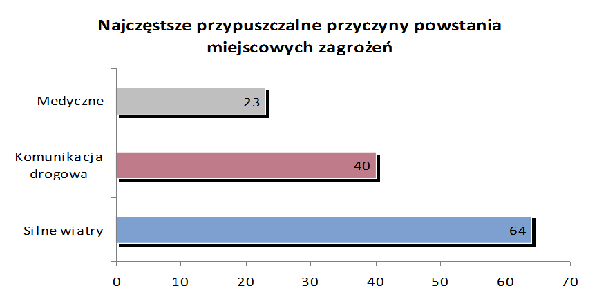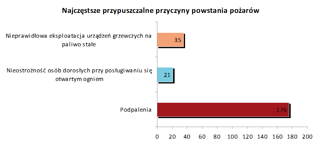 - nadal najczęstszą przypuszczalną przyczyną powstania pożarów są podpalenia i niestety trend jej jest wzrostowy (176 w 2016, 140 w 2015, 97 w 2014), natomiast w przypadku miejscowych zagrożeń są to zjawiska atmosferyczne (silne wiatry);