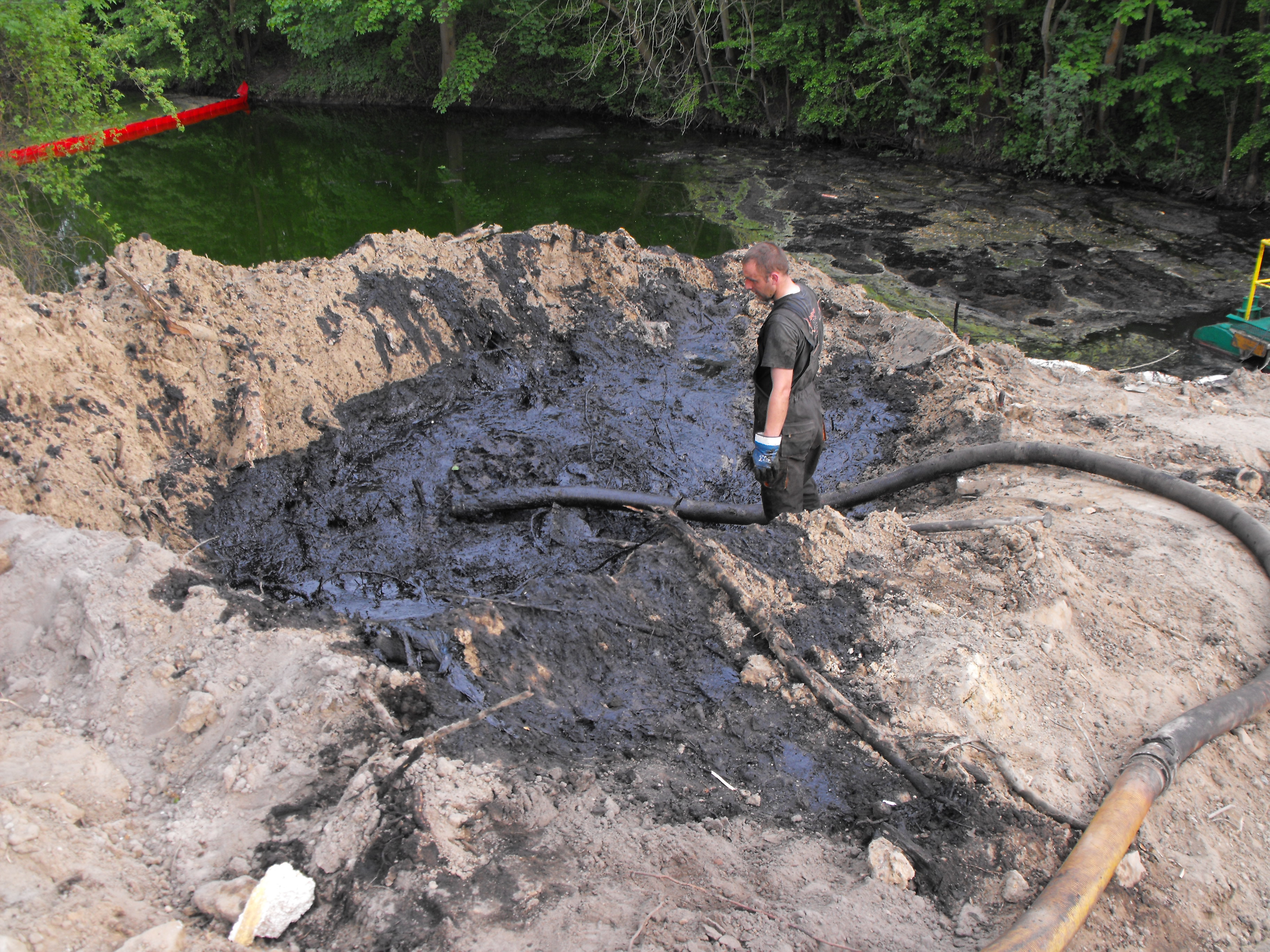 Substancja ropopochodna, która wystąpiła w kanale wodnym prawdopodobnie jest to pozostałość po fabryce benzyny syntetycznej lub wytwórni masy bitumicznej.