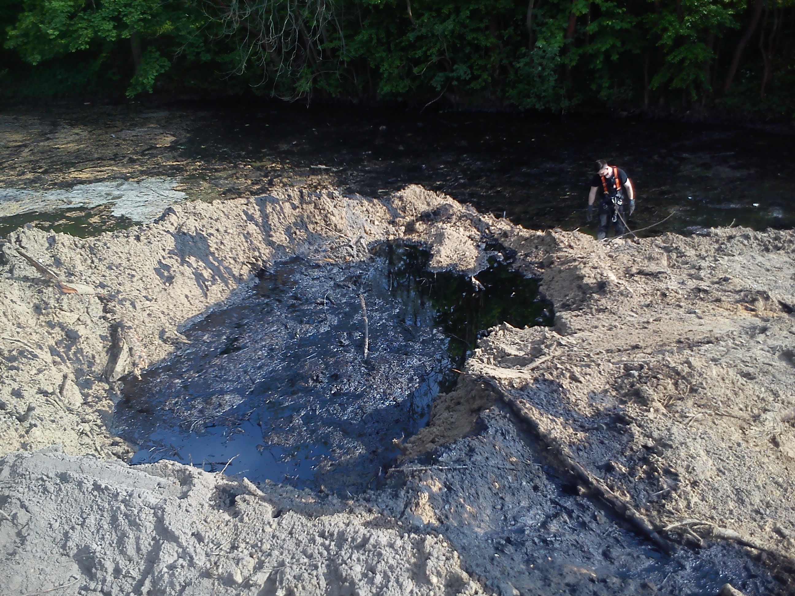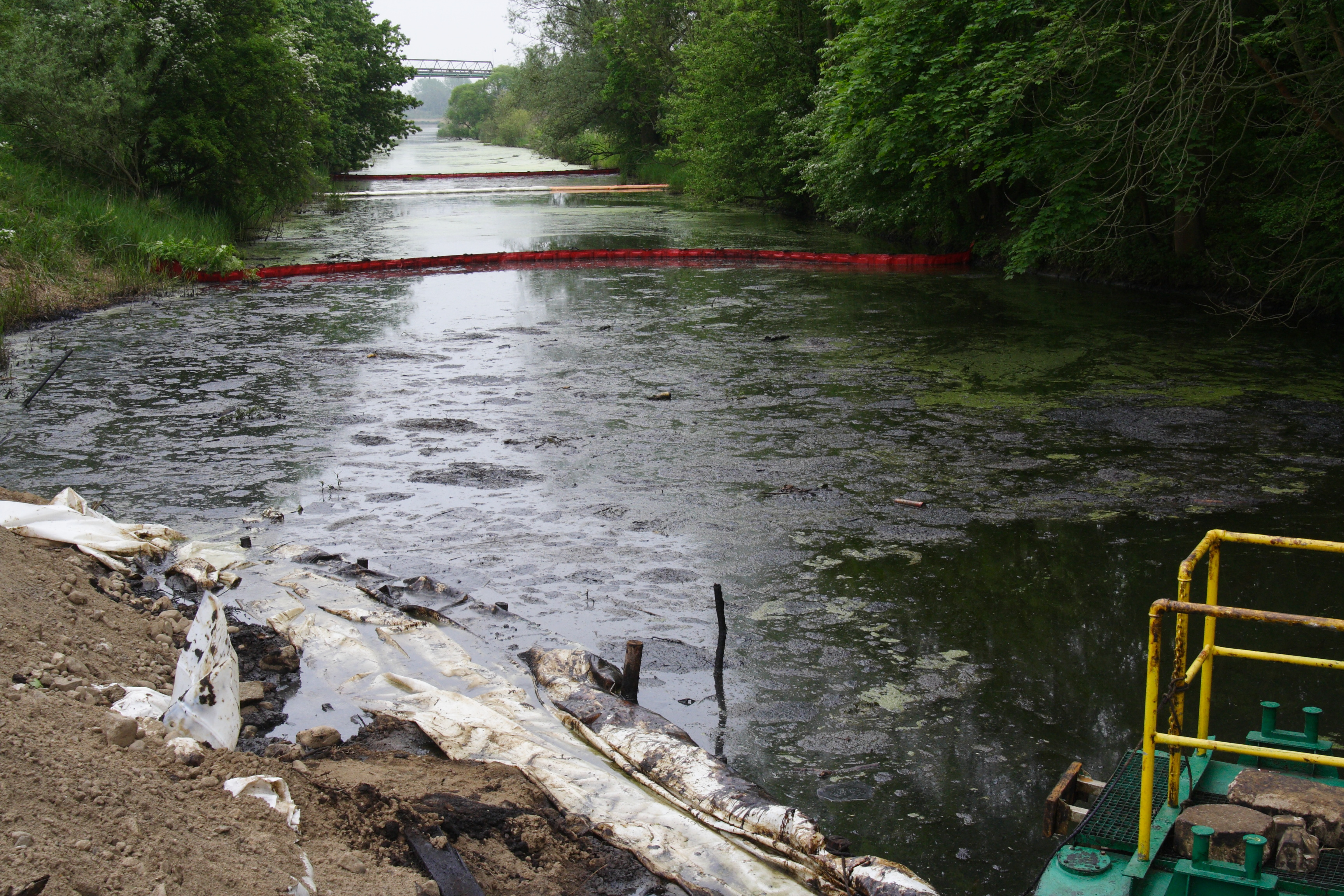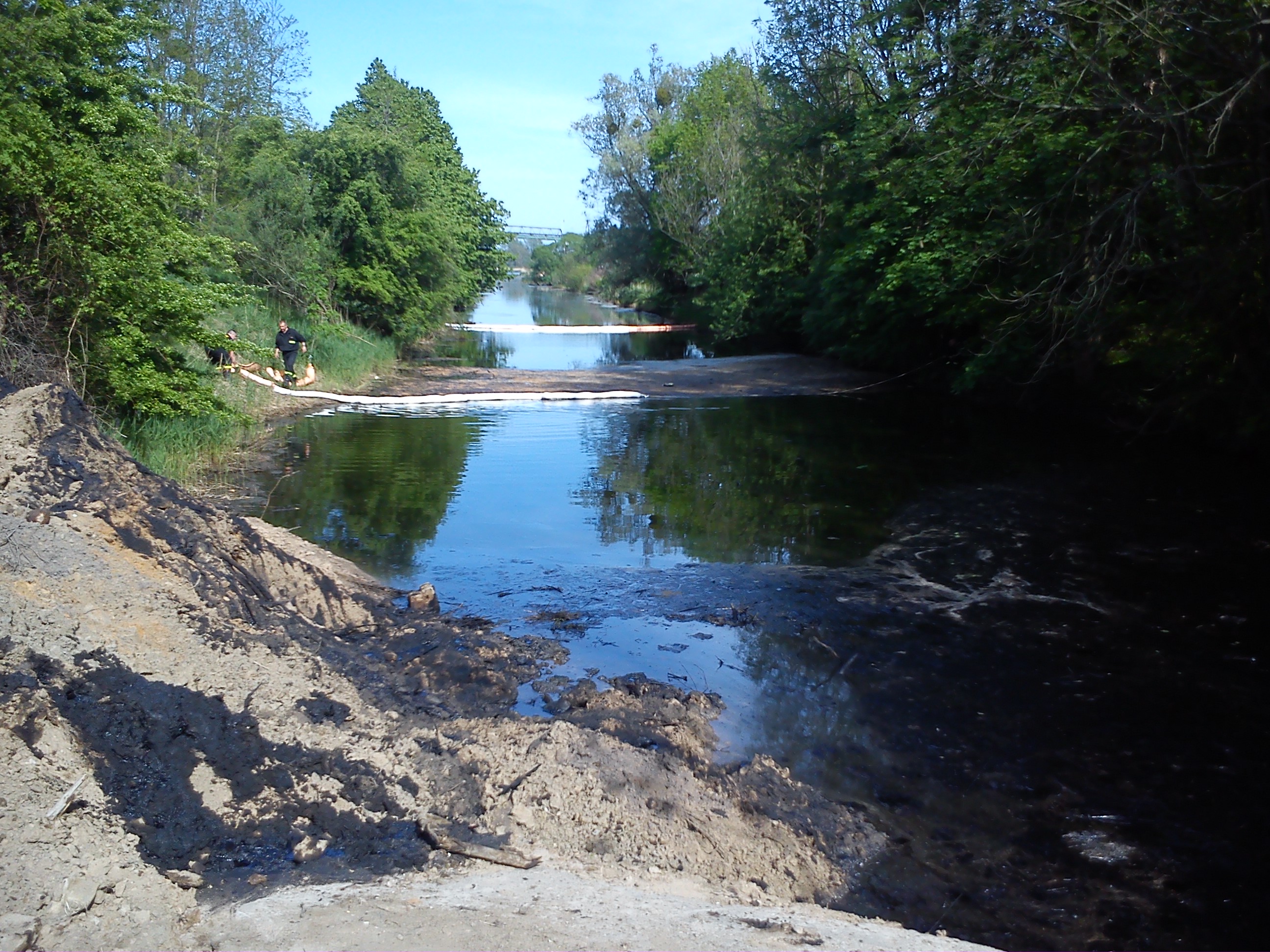 W dniu 17.05.2013 roku został poprawiony system zapór przeciwolejowych (od strony wycieku kolejno: zapora sorpcyjna, zapora elastyczna, zapora sorpcyjna i zapora elastyczna). Badania przeprowadzone przez WIOŚ wykazały, iż jest to substancja ropopochodna, która wykazuje 11 krotne przekroczenie normy indeksu oleju mineralnego i wynosi 2.20 mg oleju mineralnego na 1 litr wody. Pobrane próbki nie zidentyfikowały rodzaju substancji, swoimi cechami przypomina mazut.