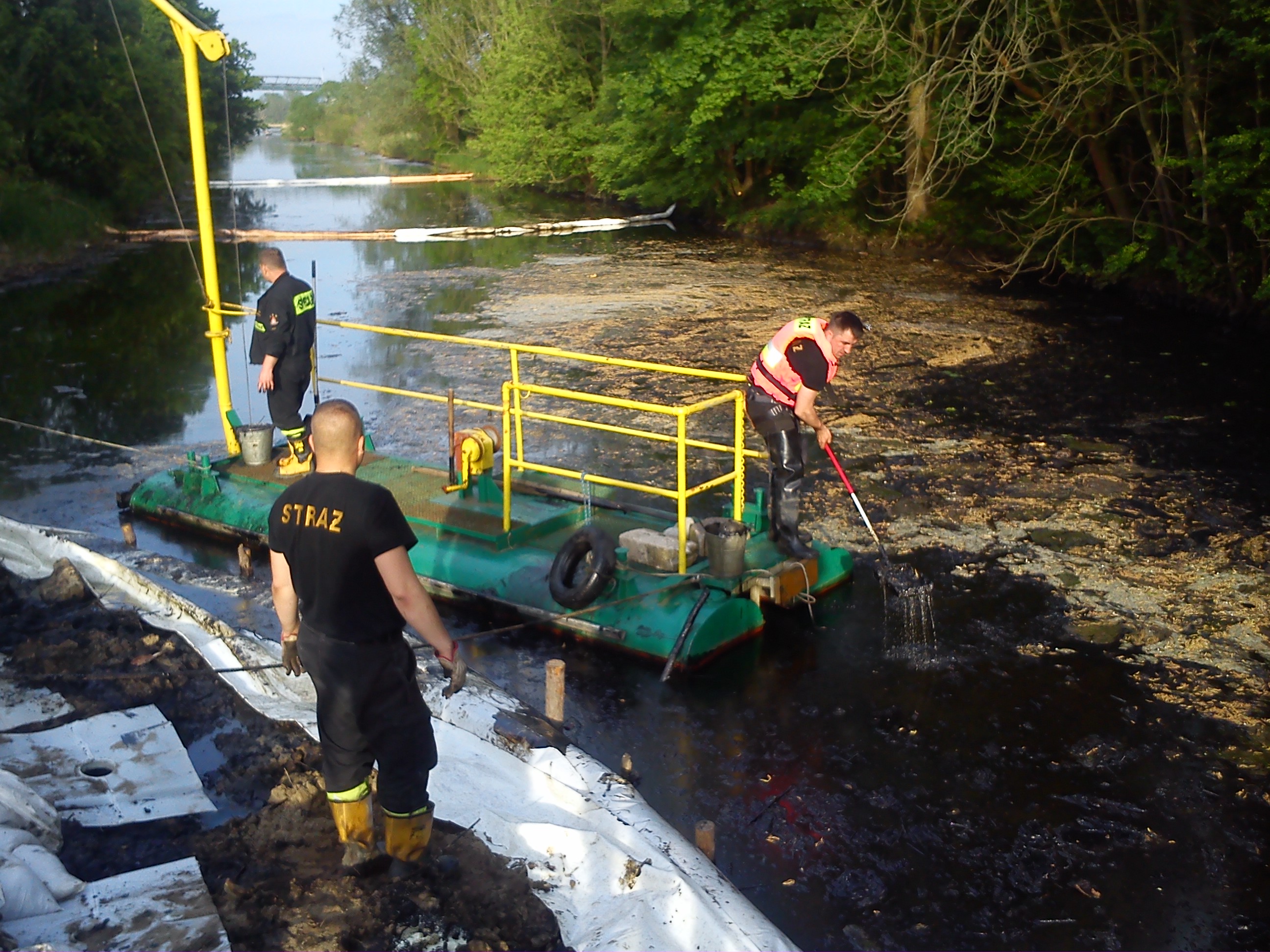 Następnie skupiono się na zbieraniu substancji z wody. W tym celu przejęto w użytkowanie pomost pływający i zaholowano go na miejsce zdarzenia. Substancje zbierano ręcznie za pomocą czerpaków i wiader, magazynowano w czterech zbiornikach plastikowych (1 m3 na palecie - pozyskanych z ZCh Police).