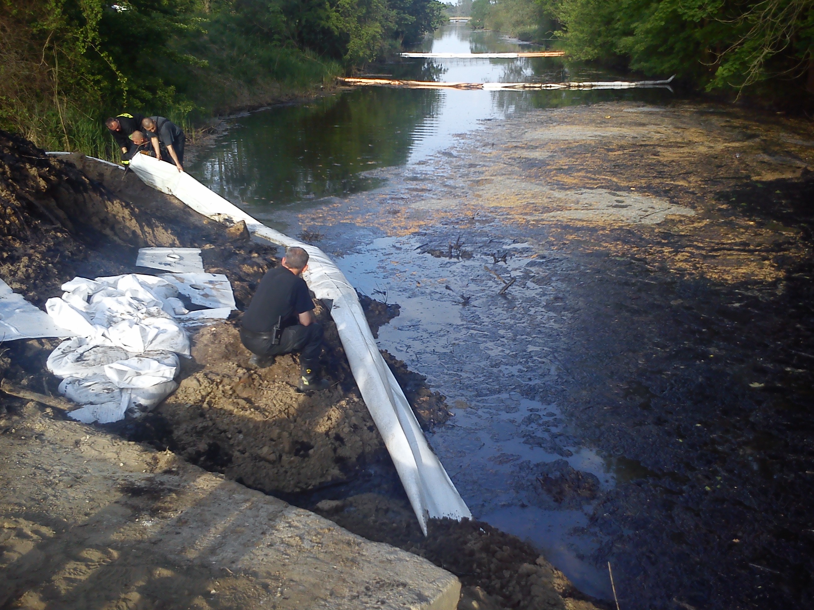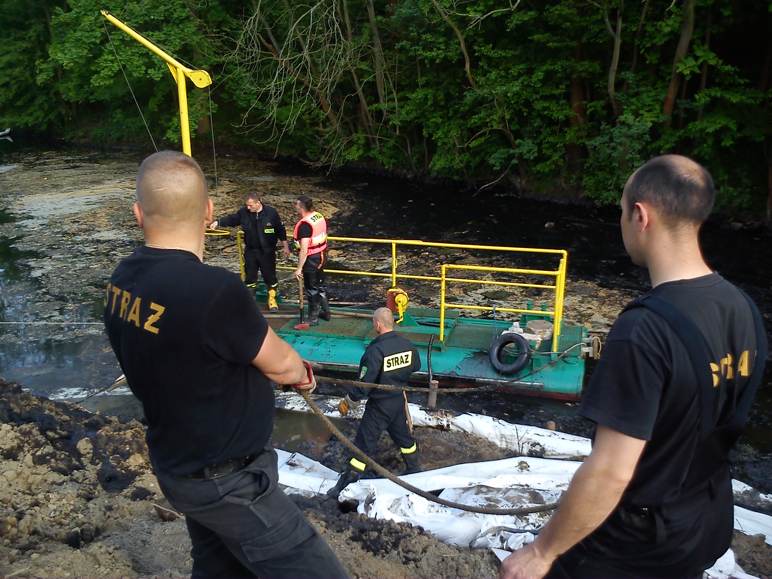 Kolejnymi czynnościami było rozwiązanie problemu, w jaki sposób można usunąć substancję ropopochodna z brzegu. Wzrost temperatury powietrza spowodował wzrost płynności substancji i jej spływanie po skarpie do wody. Grząski teren uniemożliwiał dotarcie ciężkiego sprzętu do miejsca gdzie znajdowała się substancja. Działania zastępów SP polegały na zabezpieczaniu podnóża skarpy rękawem foliowym celem zminimalizowania przedostawania się zanieczyszczenia do kanału.