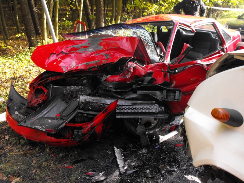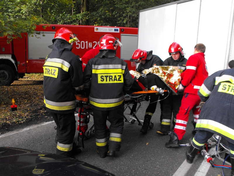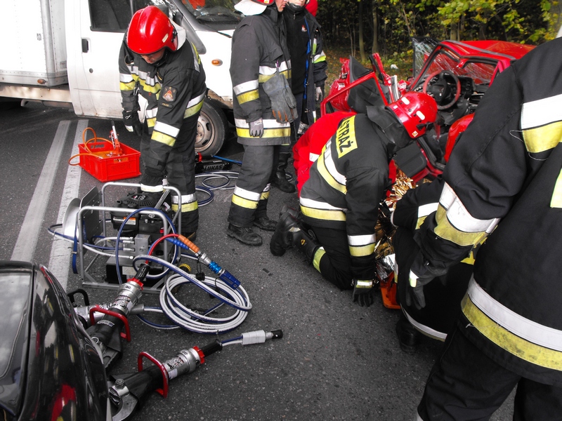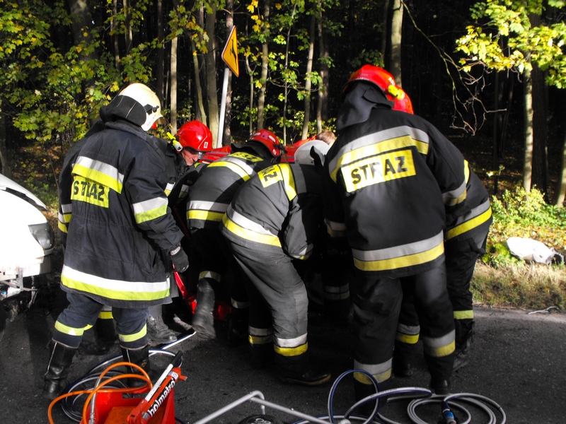 Wskutek wypadku dwie osoby zostały ranne z samochodu osobowego z czego jedna zakleszczona we wraku. Działania zastępów straży pożarnej, które przybyły na miejsce polegały na zabezpieczeniu miejsca zdarzenia, odłączeniu akumulatorów z samochodu oraz uwolnieniu osoby poszkodowanej (kierowca) z wraku samochodu przy pomocy sprzętu hydraulicznego. Osoby ranne zostały przetransportowane przez załogi Pogotowia Ratunkowego do szpitala. Przez okres prowadzenia akcji ratunkowej jak również dochodzenia przyczyn wypadku przez policję trasa Szczecin-Police była zamknięta i utworzono objazdy. W działaniach udział brały 2 zastępy z JRG Police, 1 zastęp z JRG nr 4 Szczecin, 2 załogi Pogotowia Ratunkowego oraz policja.