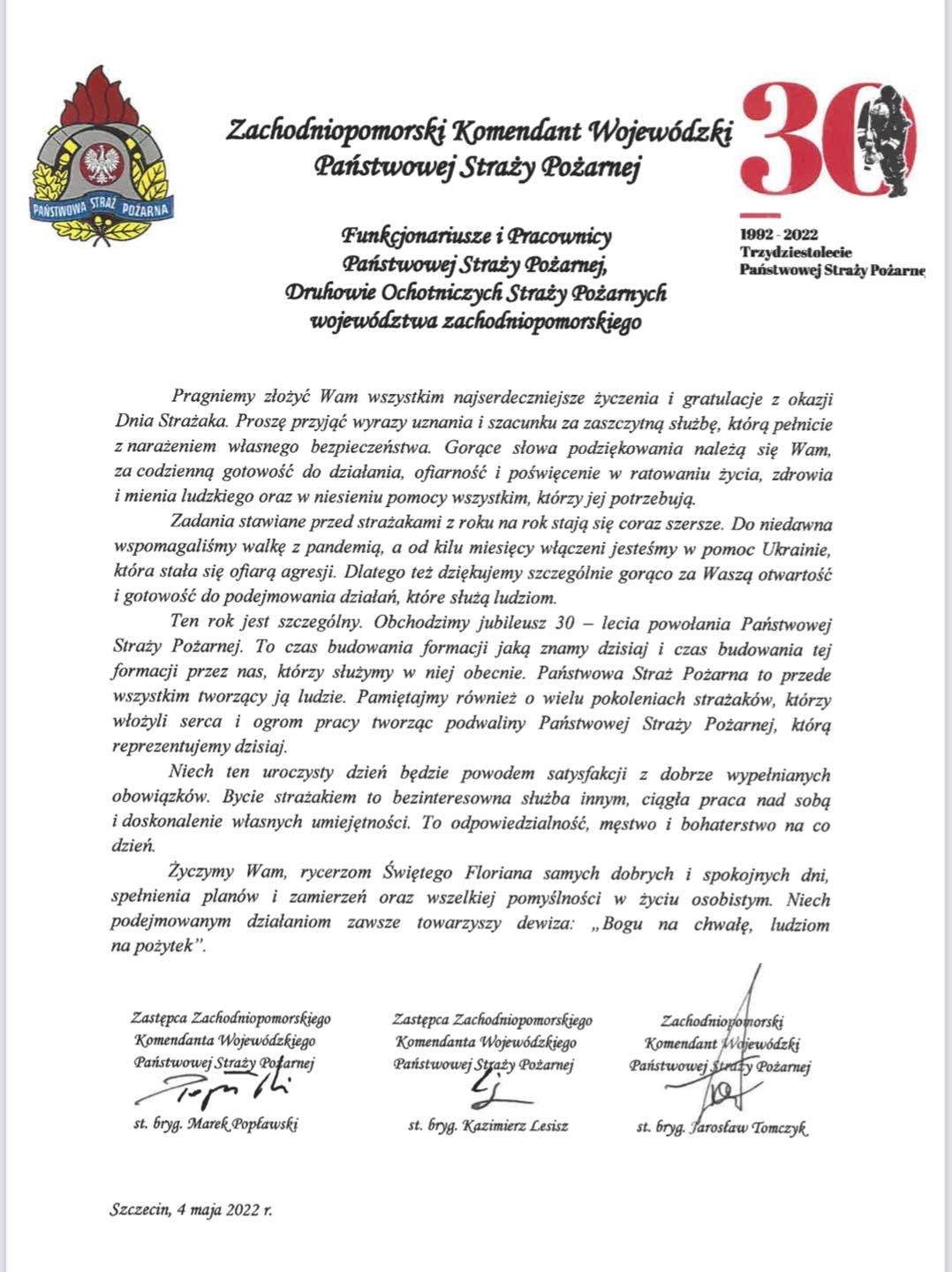 Życzenia kierownictwa Komendy Wojewódzkiej Państwowej Straży Pożarnej w Szczecinie 04.05.2022 Zdjęcia (1) Pokaż zdjęcie 1 z galerii.