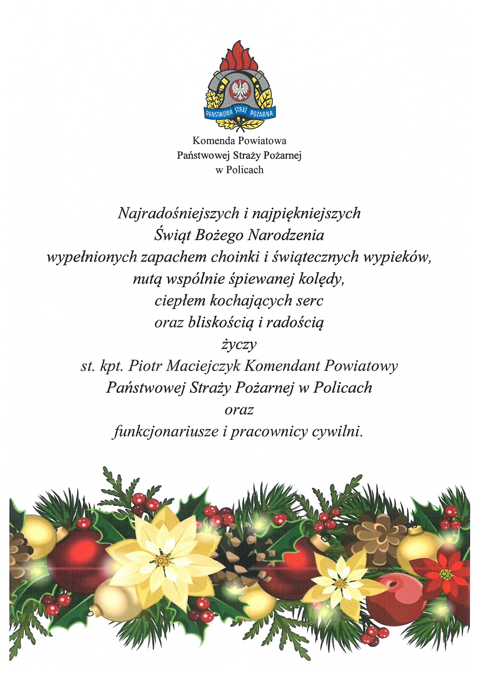 Życzenia świąteczne od Komendanta Powiatowego Państwowej Straży Pożarnej w Policach 23.12.2021 Zdjęcia (1) Pokaż zdjęcie 1 z galerii.