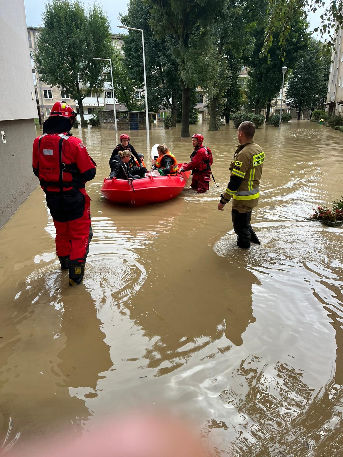 Jednocześnie, w Kłodzku i innych miejscowościach dotkniętych żywiołem, prowadzono ewakuację mieszkańców. Strażacy z Polkowic, używając samochodu operacyjnego i łodzi ratunkowej, pomagali w bezpiecznym transporcie osób z zagrożonych terenów, współpracując z innymi jednostkami w regionie.