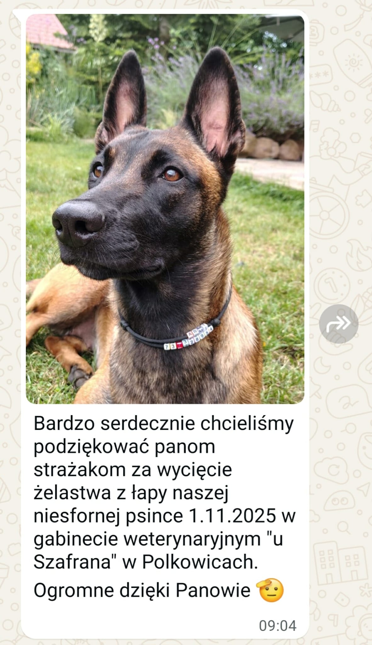 Pomocy potrzebował owczarek belgijski, któremu w łapie utknął metalowy karabińczyk. Na miejsce zdarzenia natychmiast zadysponowano zastęp strażaków z Jednostki Ratowniczo-Gaśniczej w Polkowicach.
