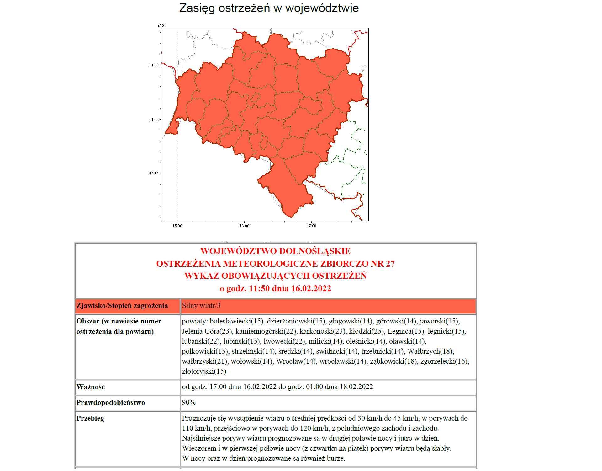 Ostrzeżenie obowiązuje od 16.02.2022 r. od godz. 17:00 do 18.02.2022 r. do godz. 01:00.