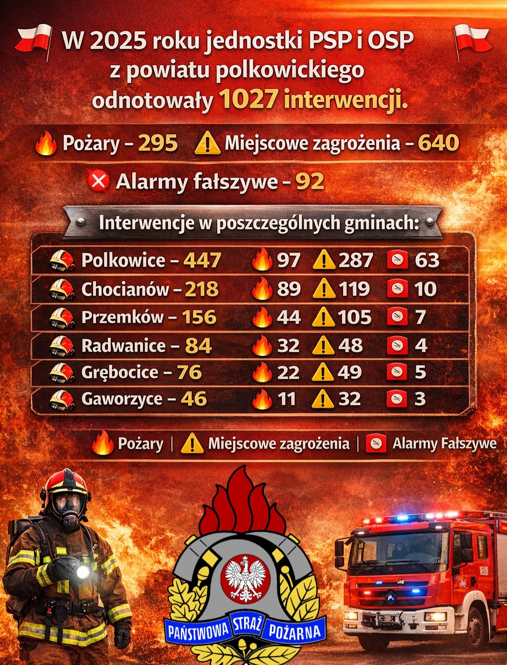 W 2025 roku jednostki Państwowej Straży Pożarnej oraz Ochotniczych Straży Pożarnych z terenu powiatu polkowickiego interweniowały łącznie 1027 razy.