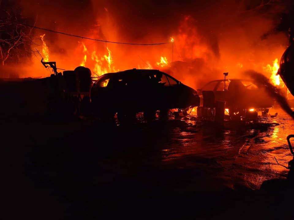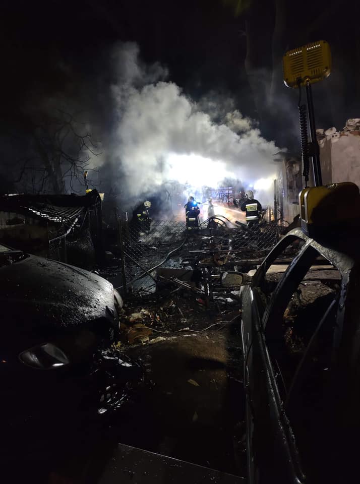 KDR po przyjeździe na miejsce zdarzenia stwierdził, że pożarem objęte są pomieszczenia gospodarcze, garaż, kurnik, wiata w zabudowie szeregowej oraz 2 samochody osobowe.