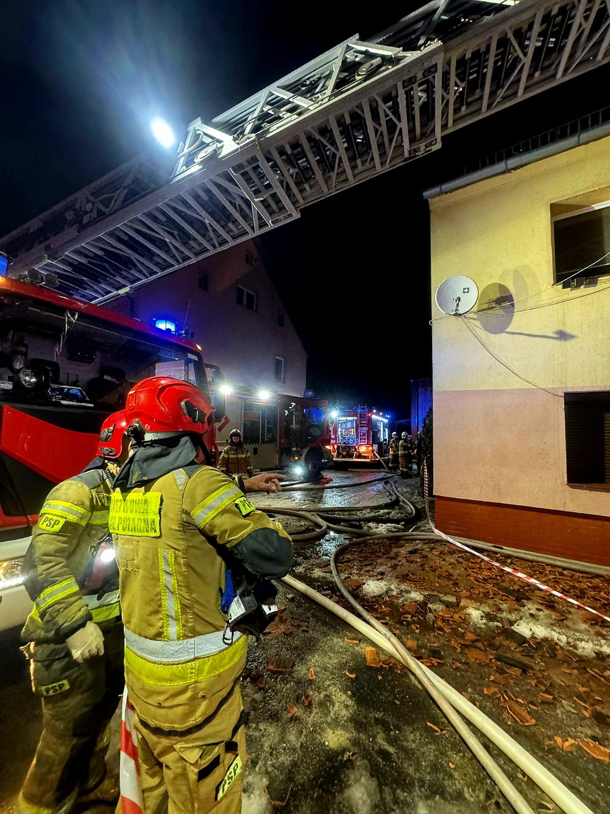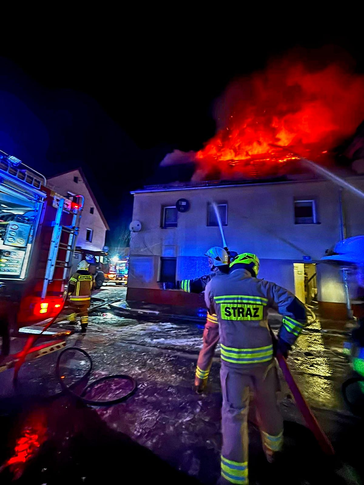 Strażacy niezwłocznie przystąpili do działań gaśniczych, podając prądy wody w natarciu oraz zabezpieczając obiekt przed dalszym rozprzestrzenianiem się ognia. Działania prowadzone były zarówno wewnątrz budynku, jak i z zewnątrz.