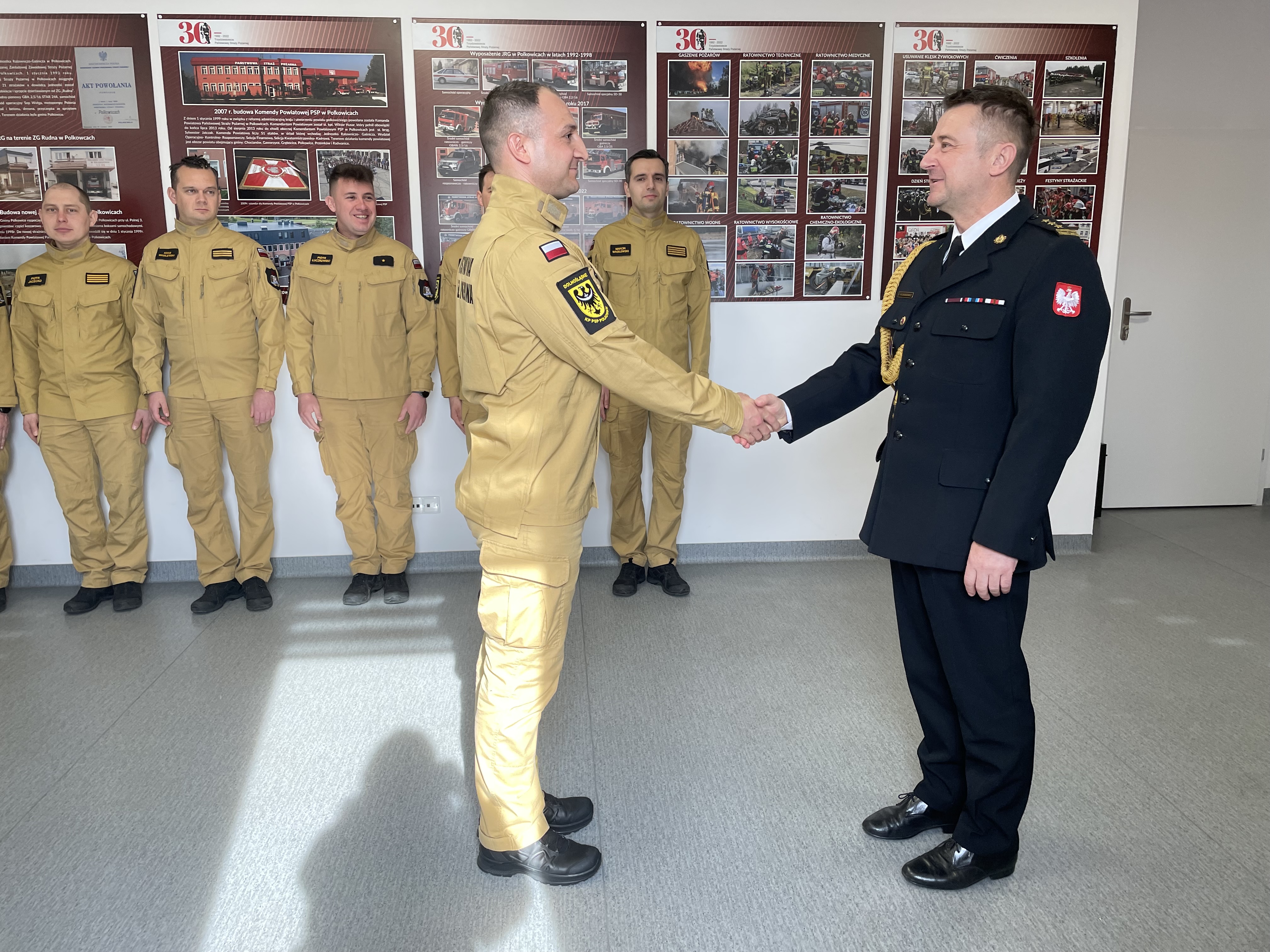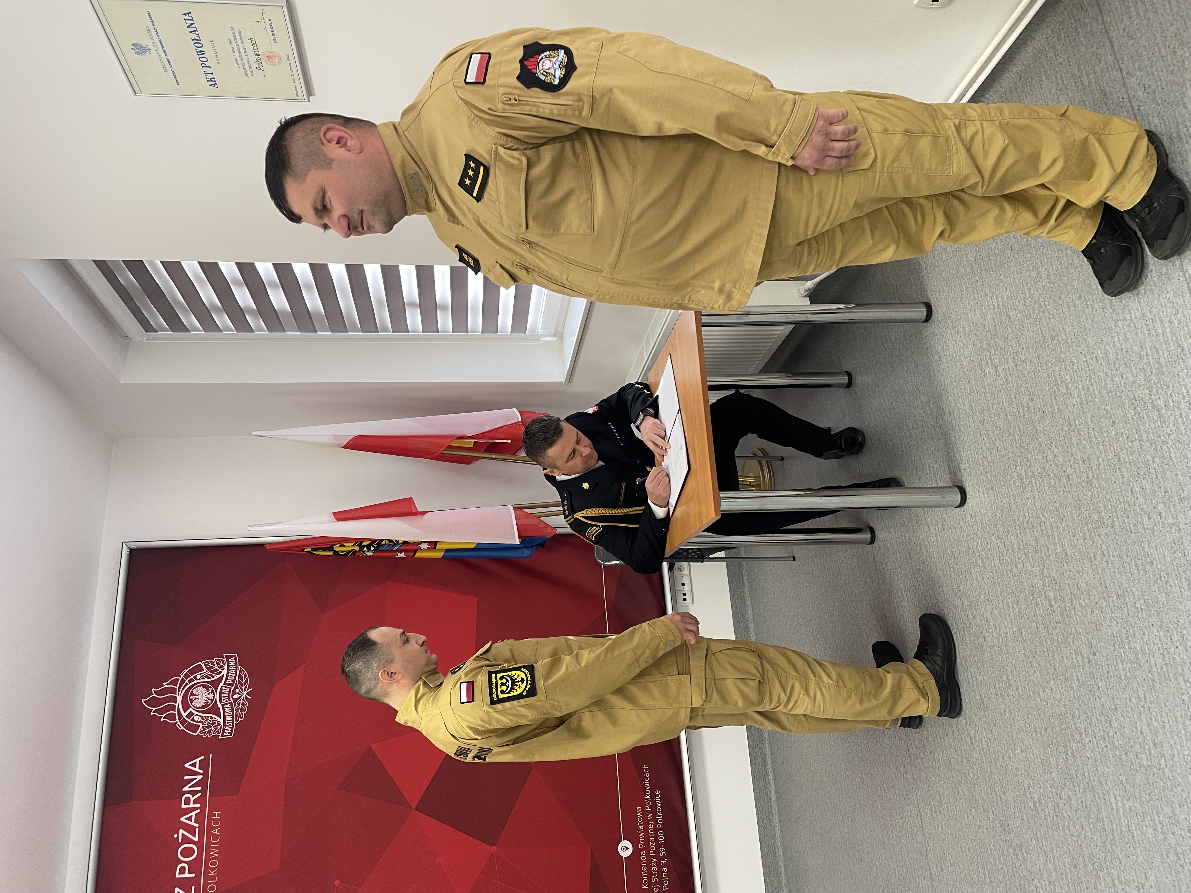 Na wstępie Komendant Powiatowy pogratulował i powitał nowego funkcjonariusza w służbie, nawiązując do roty ślubowania, podkreślając znaczenie tej chwili w życiu zawodowym każdego strażaka. Zaznaczył także, że funkcjonariusz reprezentuje tą zasłużoną formację nie tylko w czasie służby, ale także poza nią.