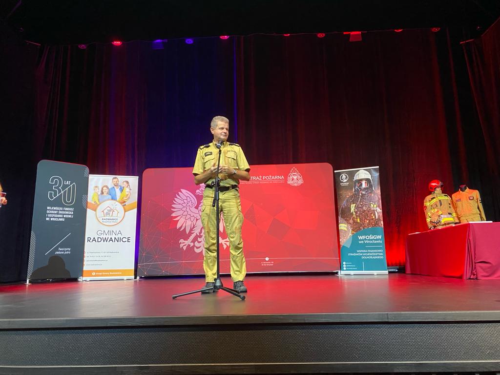 Dnia 13 października 2023 r. w Domu Kultury w Radwanicach odbyła się uroczysta zbiórka z okazji wręczenia czeków okolicznościowych w ramach Programu naboru wniosków na dofinansowanie zadań związanych z podniesieniem gotowości bojowej lokalnych służb ratowniczych poprzez doposażenie jednostek Ochotniczych Straży Pożarnych ze środków Wojewódzkiego Funduszu Ochrony Środowiska i Gospodarki Wodnej we Wrocławiu oraz Narodowego Funduszu Ochrony Środowiska i Gospodarki Wodnej pn. "Ogólnopolski program finansowania służb ratowniczych Część 2). Dofinansowanie zakupu sprzętu i wyposażenia jednostek Ochotniczych Straży Pożarnych".