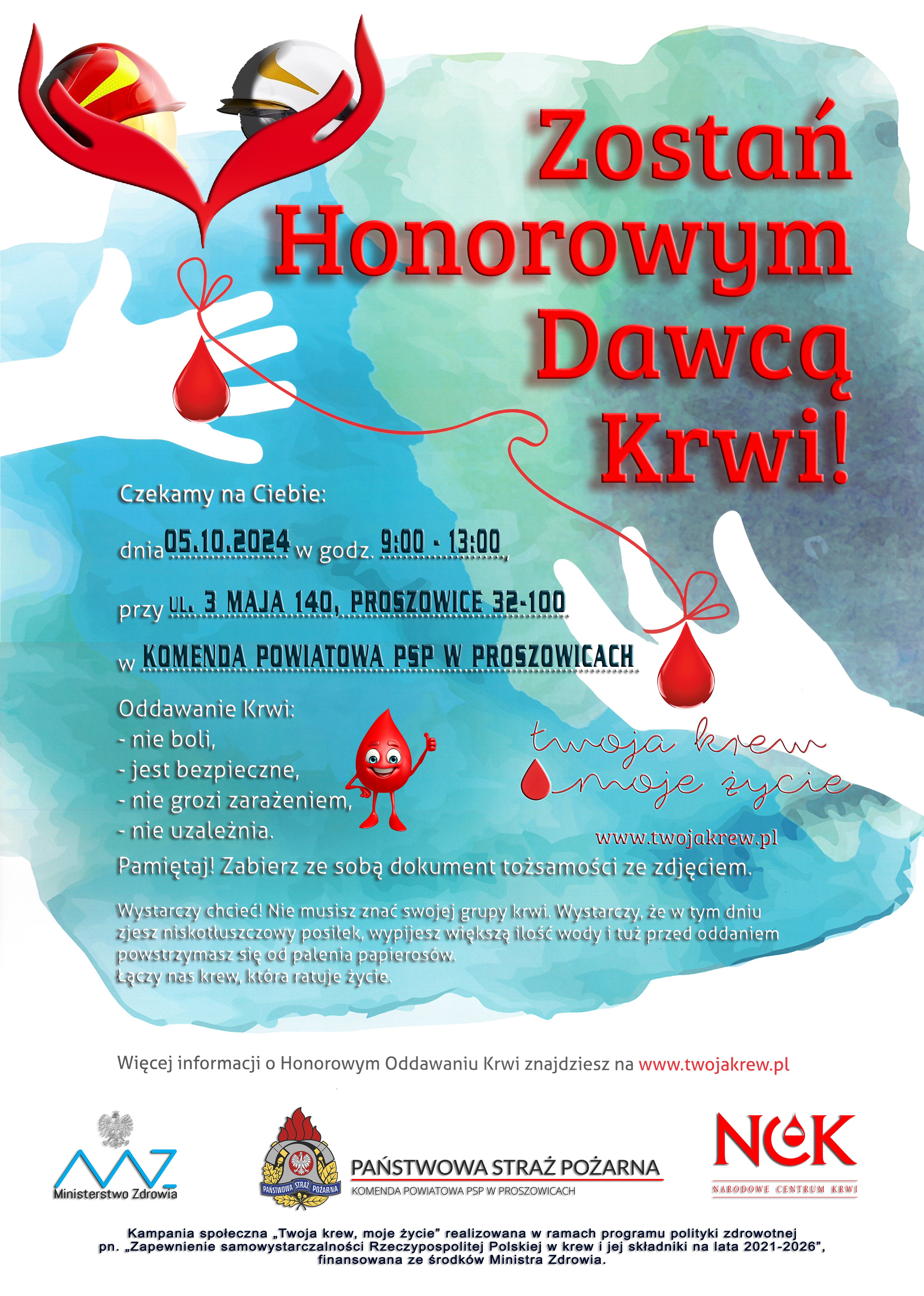 Zapraszamy 5 października 2024 roku do Komendy Powiatowej PSP w Proszowicach na akcje krwiodawstwa. Zbiórka odbędzie się w godzinach 9:00 - 13:00.