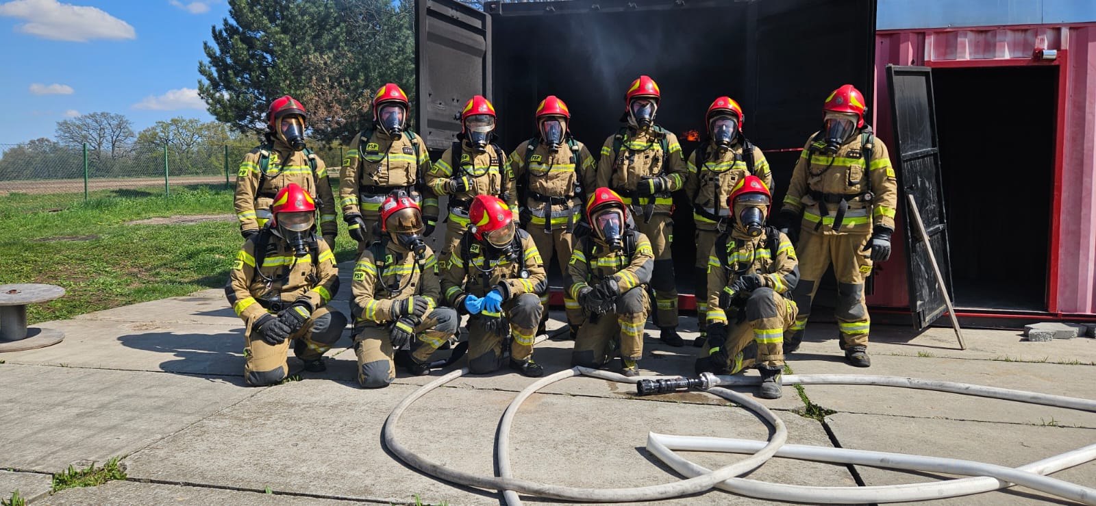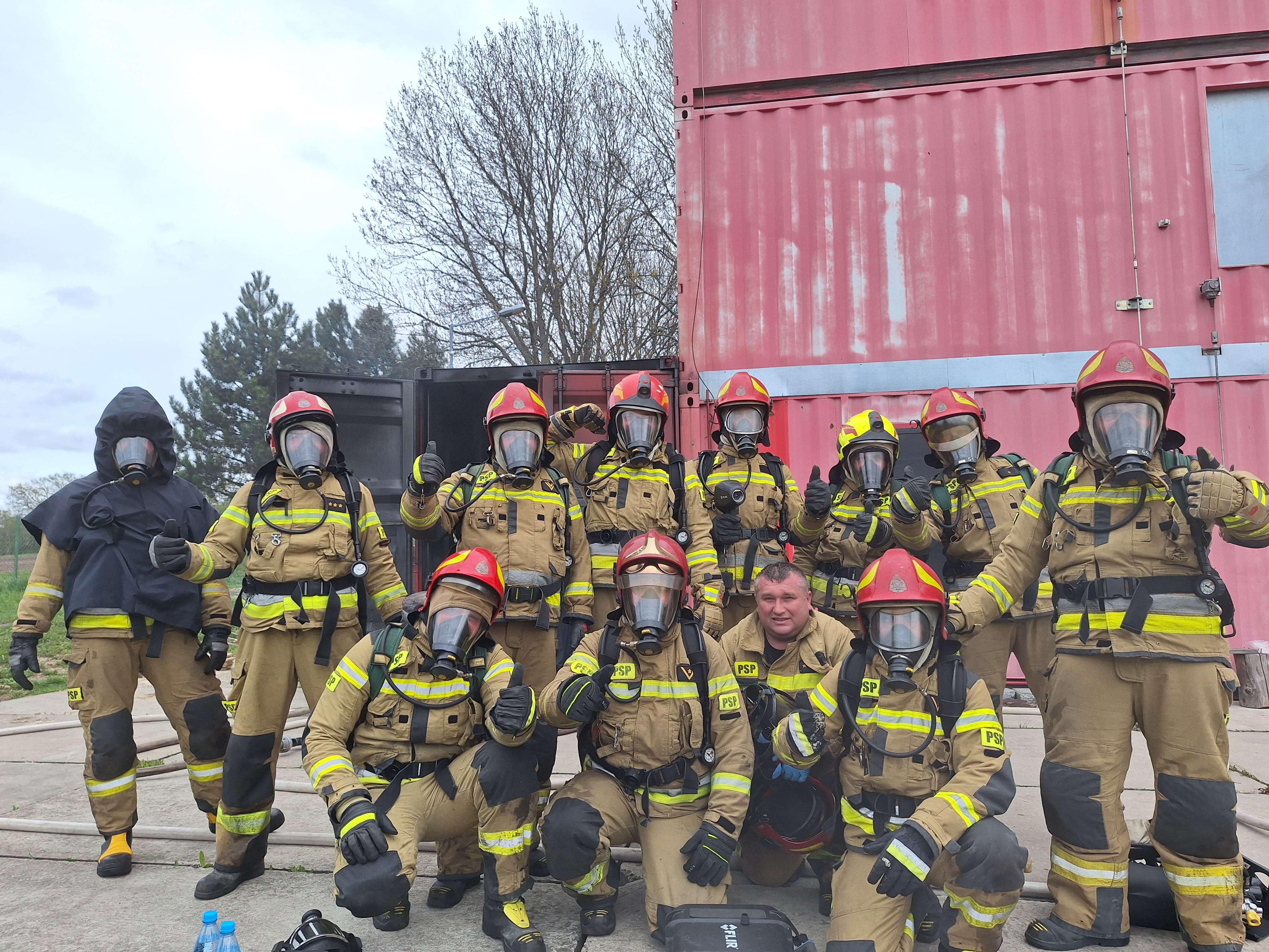 14,15,16 kwietnia 2025r. strażacy z Jednostki Ratowniczo – Gaśniczej w Proszowicach w ramach doskonalenia zawodowego ćwiczyli w kontenerze ogniowym zlokalizowanym na terenie Poligonu Szkoły Aspirantów PSP w Kościelcu.