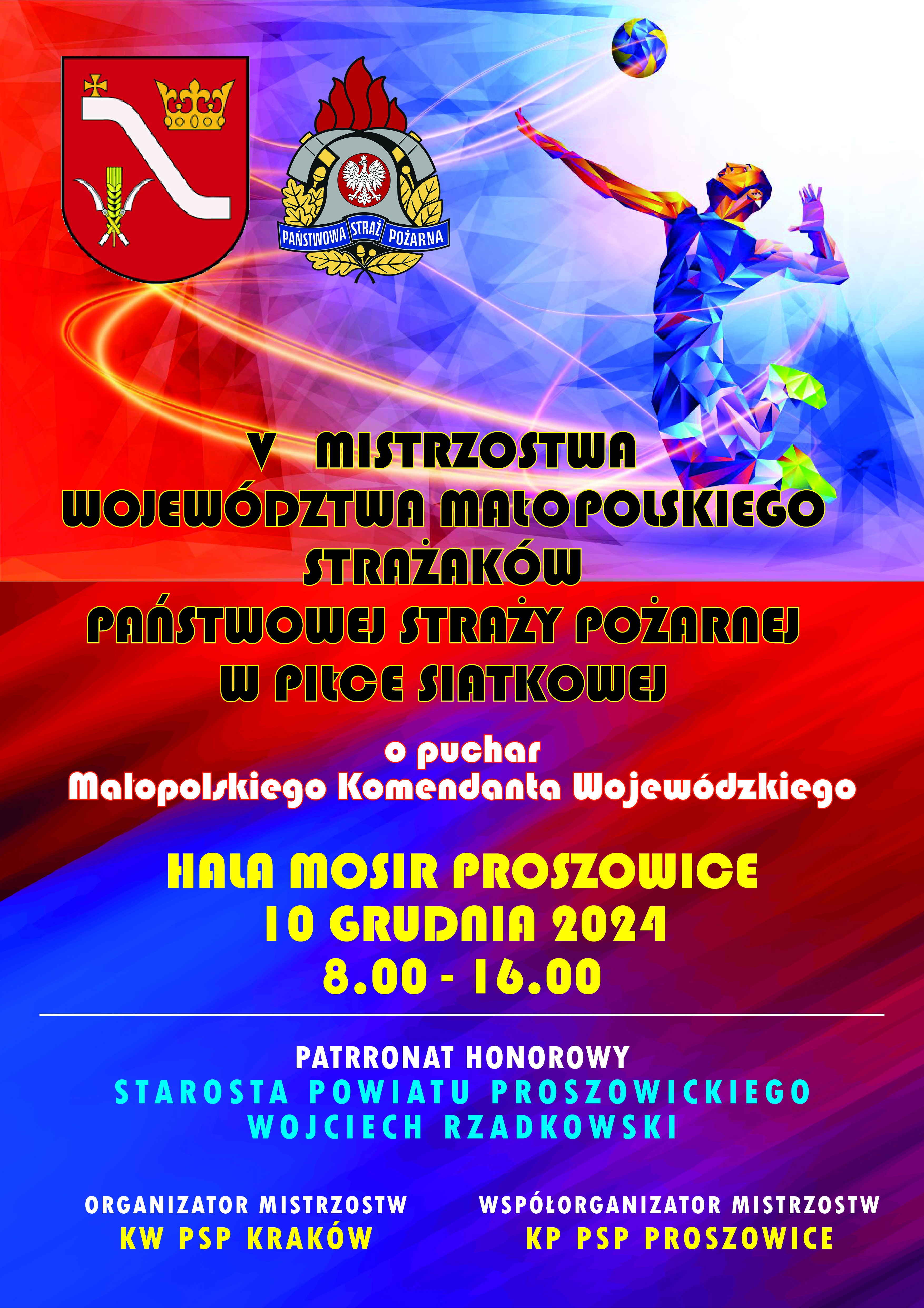 10 grudnia 2024 roku w hali MOSiR w Proszowicach odbędą się mistrzostwa województwa małopolskiego strażaków Państwowej Straży Pożarnej w siatkówce. Organizatorem jest Komenda Wojewódzka PSP w Krakowie, współorganizatorem Komenda Powiatowa PSP w Proszowicach. Patronat honorowy objął Starosta Powiatu Proszowickiego Wojciech Rzadkowski. Zapraszamy już od godziny 8:00