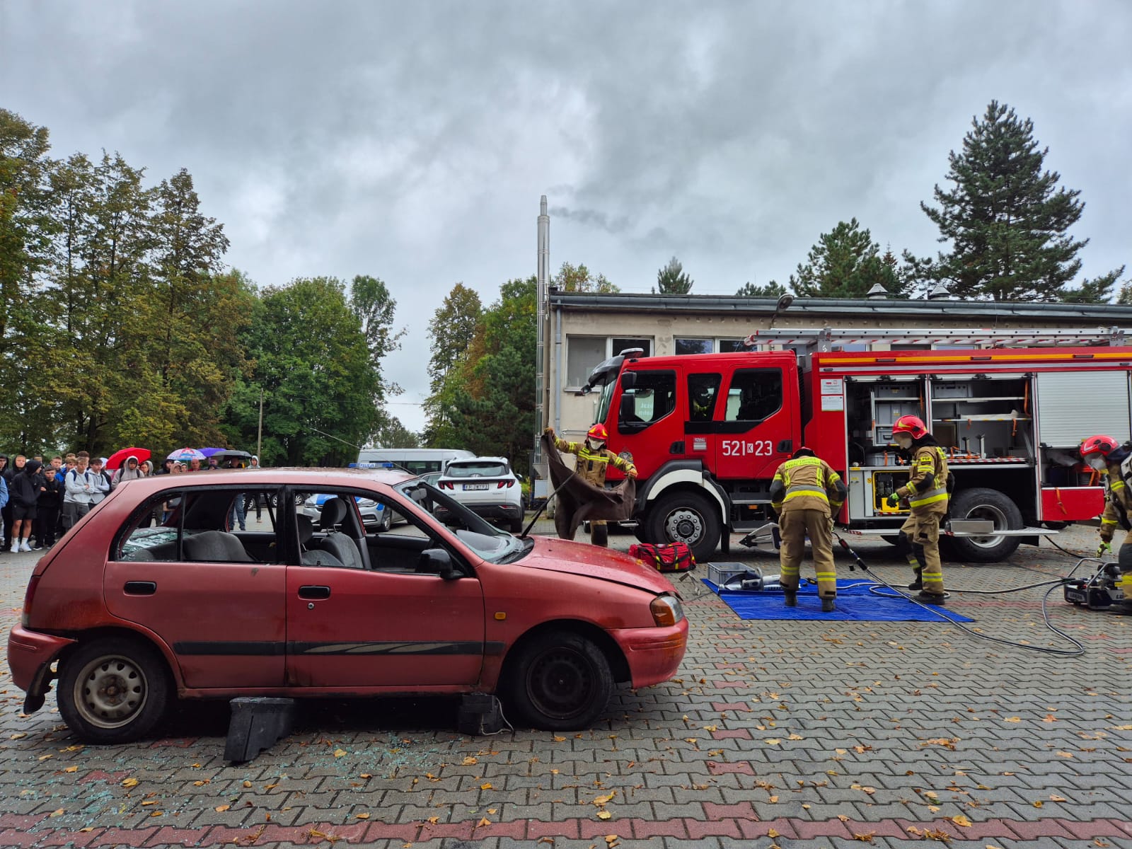 Strażacy przeprowadzili pokaz ratownictwa technicznego, w którym uświadamiali uczniów jak ważne jest zachowanie bezpieczeństwa podczas jazdy samochodem.