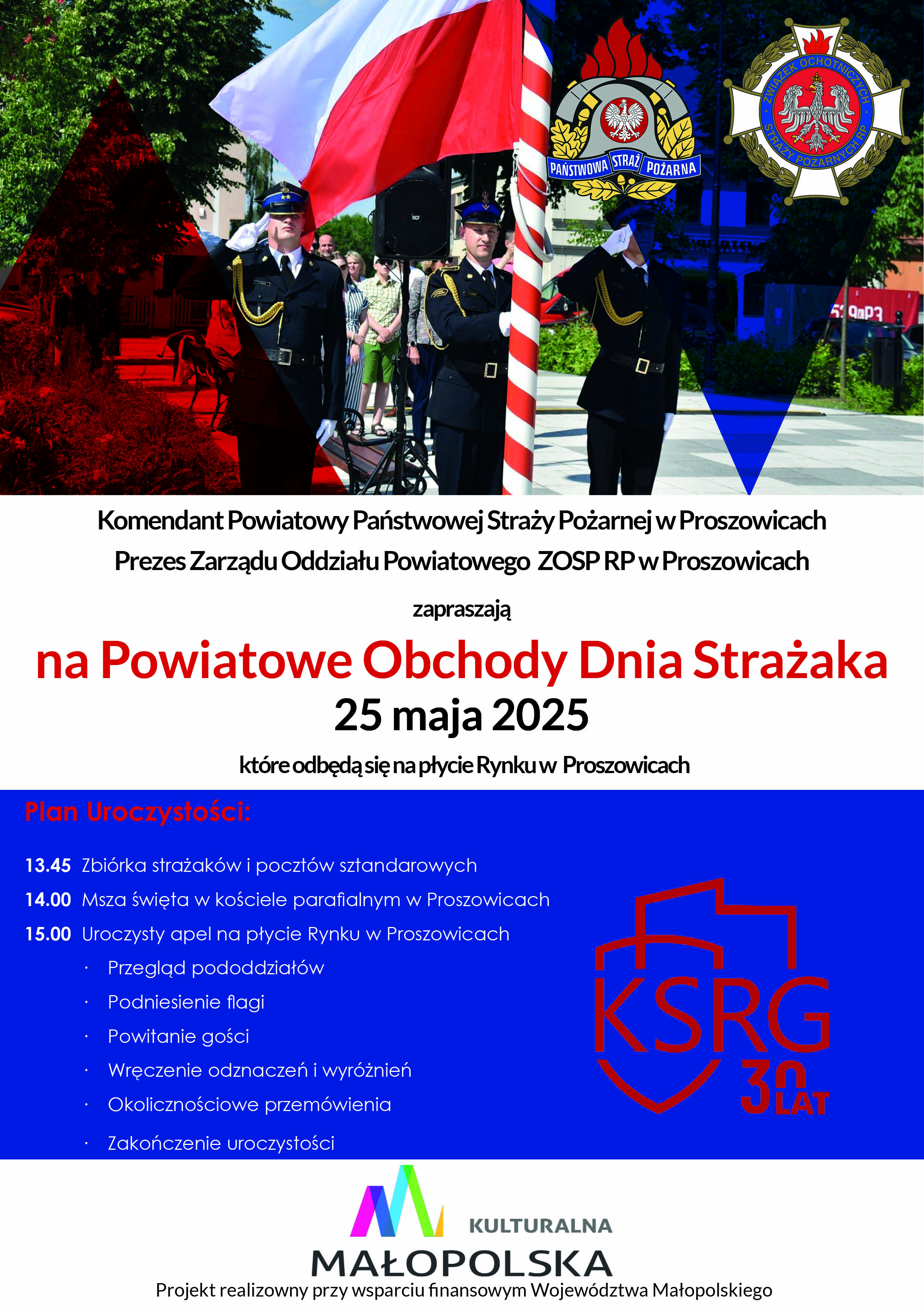 Komendant Powiatowy Państwowej Straży Pożarnej w Proszowicach i Prezes Zarządu Oddziału Powiatowego ZOSP RP w Proszowicach, zapraszają na Powiatowe Obchody Dnia Strażaka, które odbędą się 25 maja 2025 roku w Proszowicach. Szczegóły na plakacie.