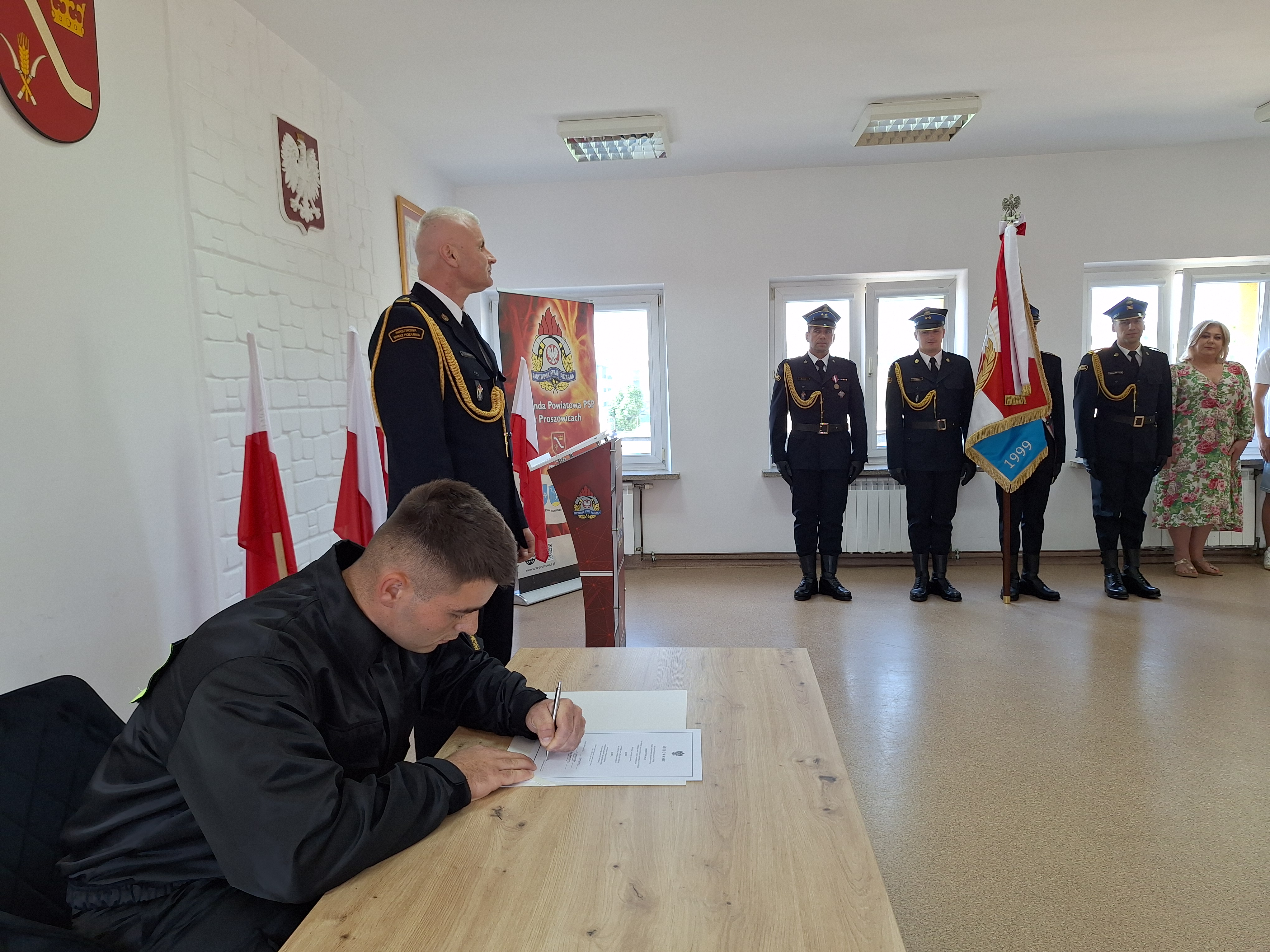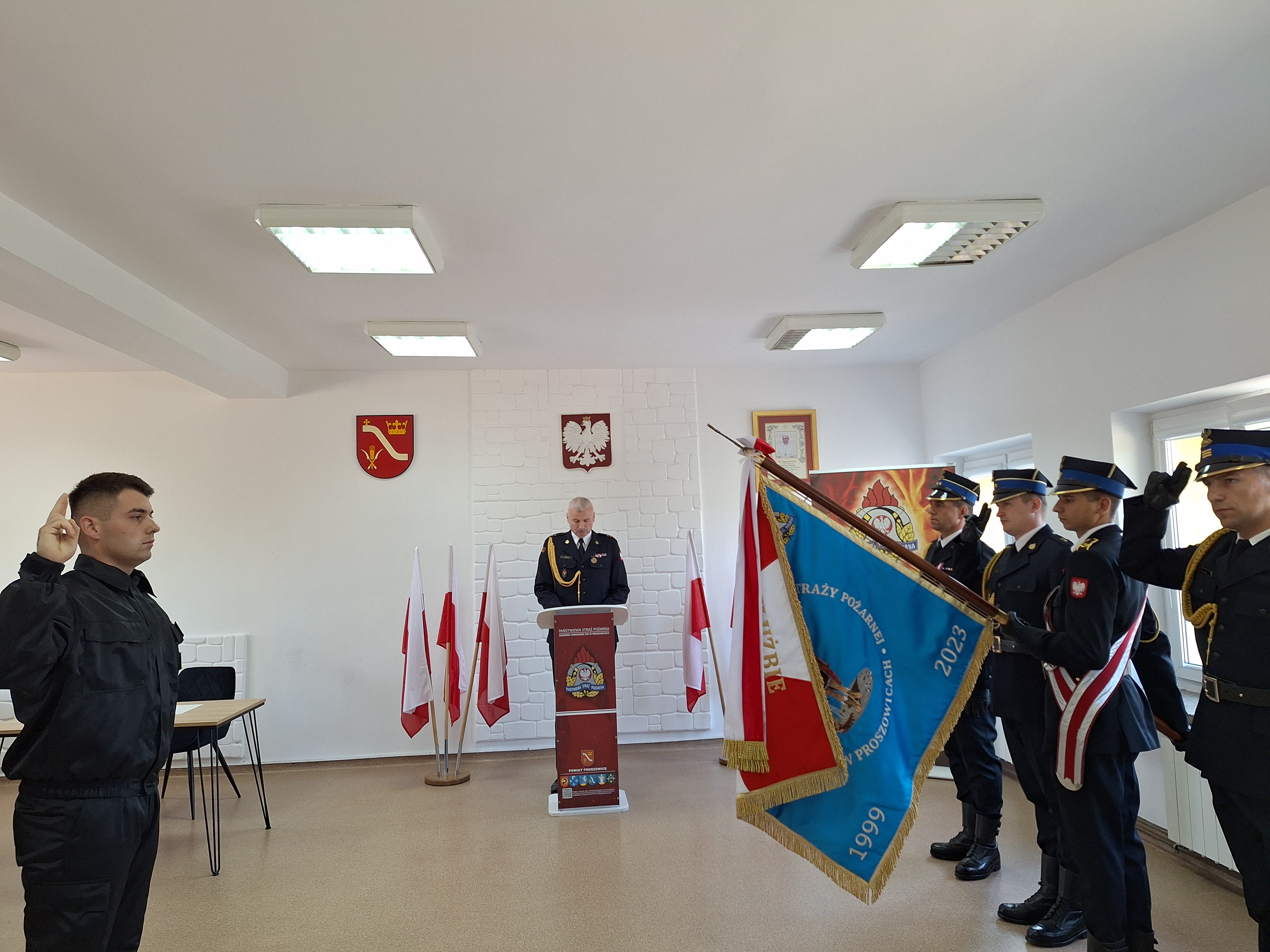 Ślubowanie przyjął Komendant Powiatowy PSP bryg. Zbigniew Kwinta w obecności Zastępcy Komendanta Powiatowego PSP bryg. Michała Pawłowskiego, strażaków i pracowników Komendy oraz bliskich zaproszonych przez ślubującego.