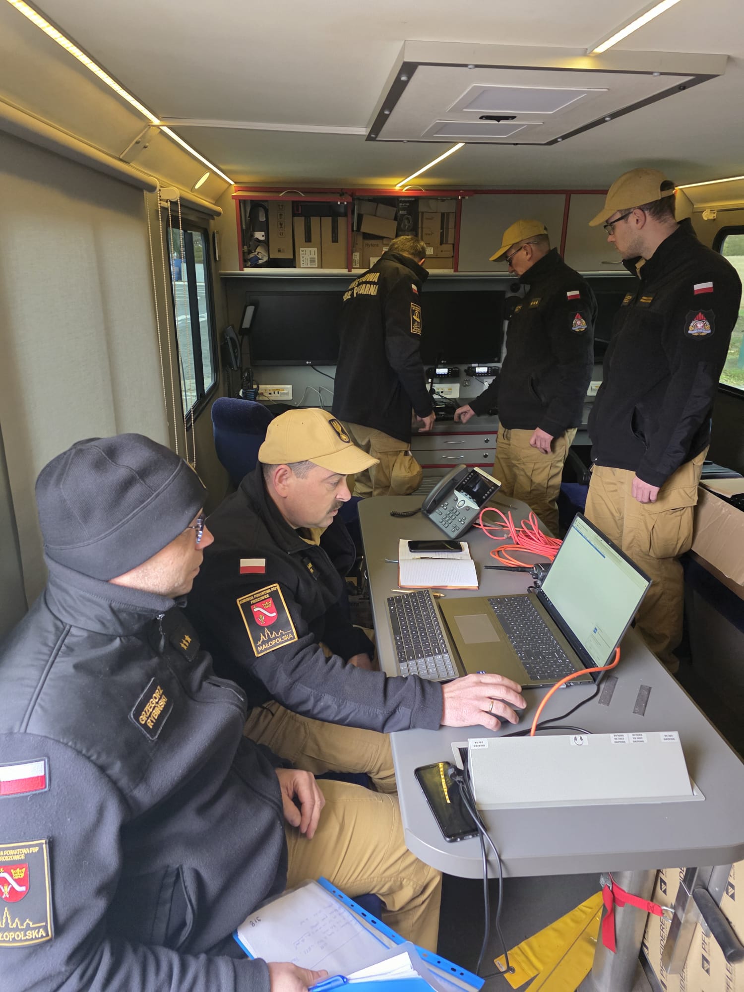 W ramach ćwiczeń przeprowadzono ewakuację Stanowiska Kierowania Komendanta Powiatowego PSP w Proszowicach do zapasowego miejsca utworzonego na bazie samochodu dowodzenia i łączności z SA PSP w Krakowie.