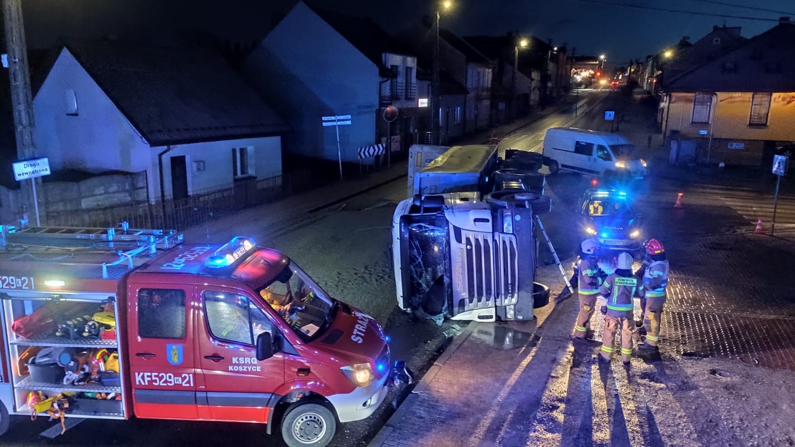 8 stycznia 2025 r Stanowisko Kierowania Komendanta Powiatowego PSP w Proszowicach otrzymało zgłoszenie o wypadku samochodu ciężarowego w Koszycach. Po przybyciu na miejsce potwierdzono, że na Drodze Krajowej nr 79 na prawym boku jest przewrócony samochód ciężarowy. Strażacy udzieli pomocy medycznej kierowcy pojazdu, który następnie został przetransportowany karętką pogotowia do szpitala. Po wykonaniu czynności dochodzeniowych przez funkcjnariuszy Policji postawiono pojazd na koła oraz przywrócono ruch na DK 79.