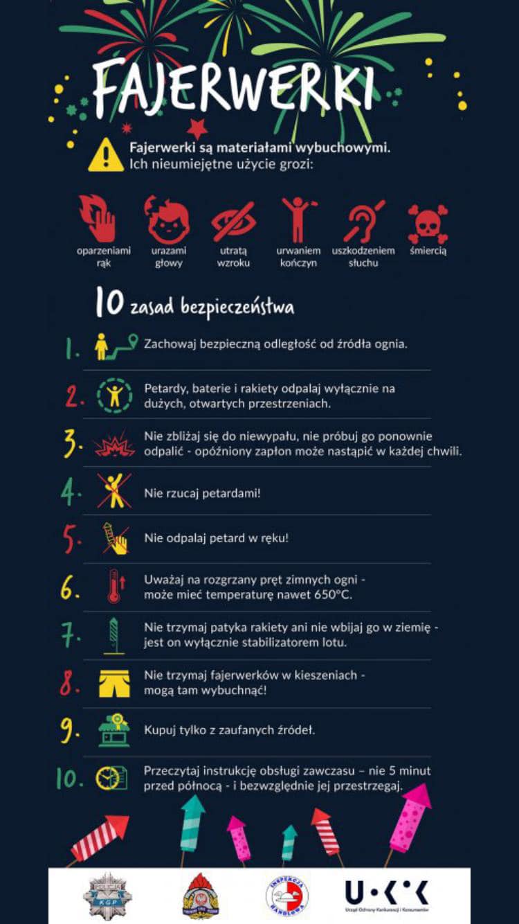 Sylwester i Nowy Rok przed Nami, pamietajmy o podstawowych zasadach bezpieczeństwa, które przedstawia grafika. Przypominamy również, że fajerwerki są materiałami wybuchowymi.