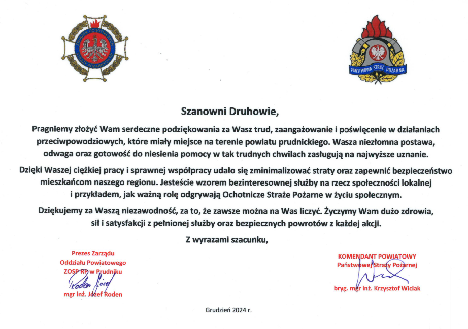 Podziękowania Komendanta Powiatowego PSP i Prezesa Zarządu Oddziału Powiatowego ZOSP RP dla druhów OSP za trud, zaangażowanie i poświęcenie w działaniach przeciwpowodziowych.