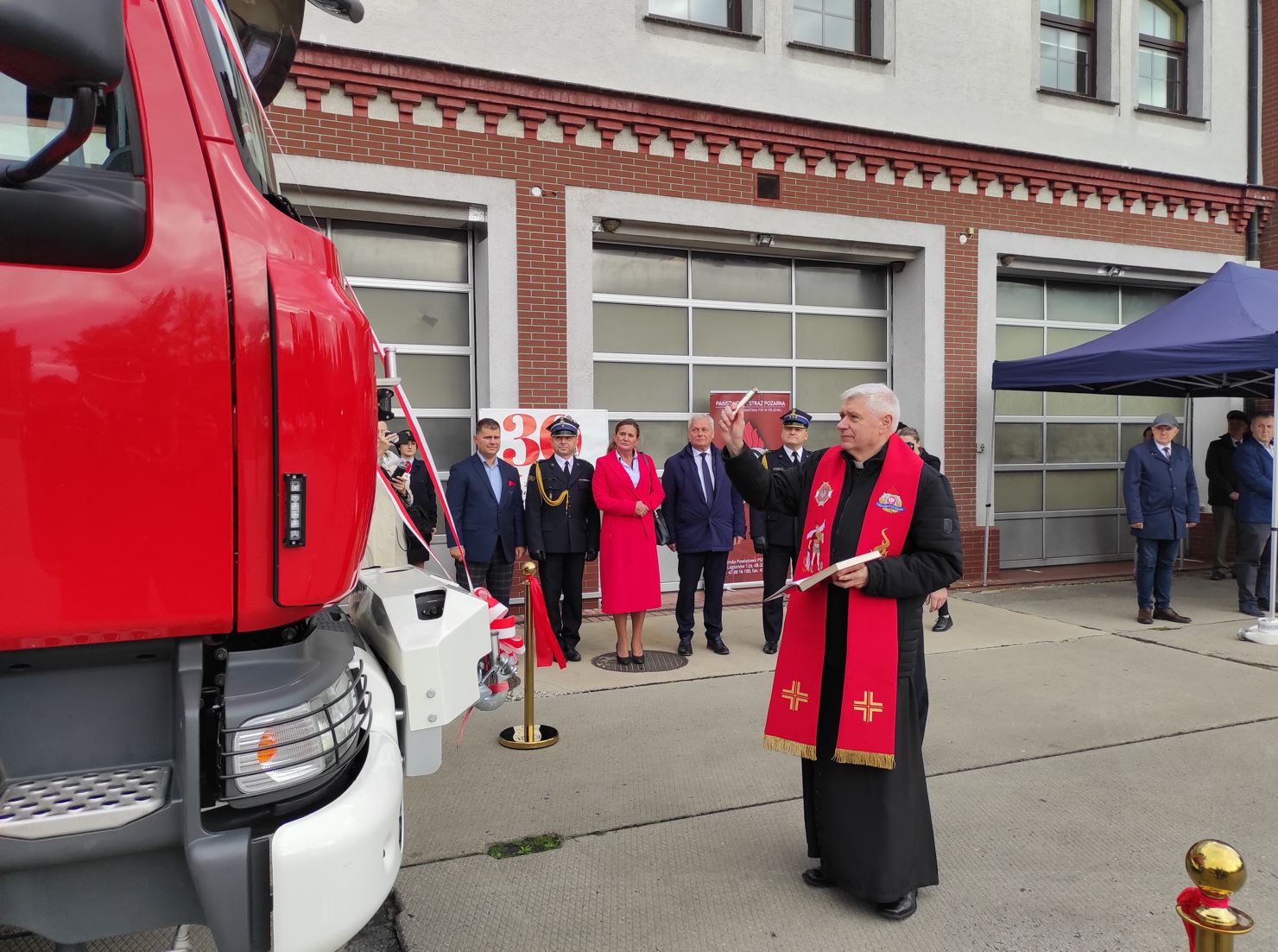 Następnie odczytano akt przekazania średniego samochodu ratowniczo gaśniczego Renault dla Komendy Powiatowej PSP Prudniku. Wręczenia kluczyków, przecięcia wstęgi oraz poświęcenia samochodu dokonali przybyli na uroczystość goście.
