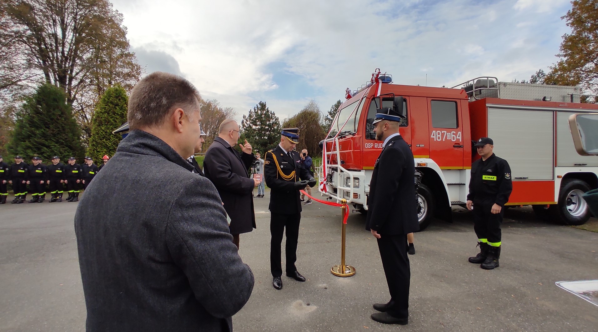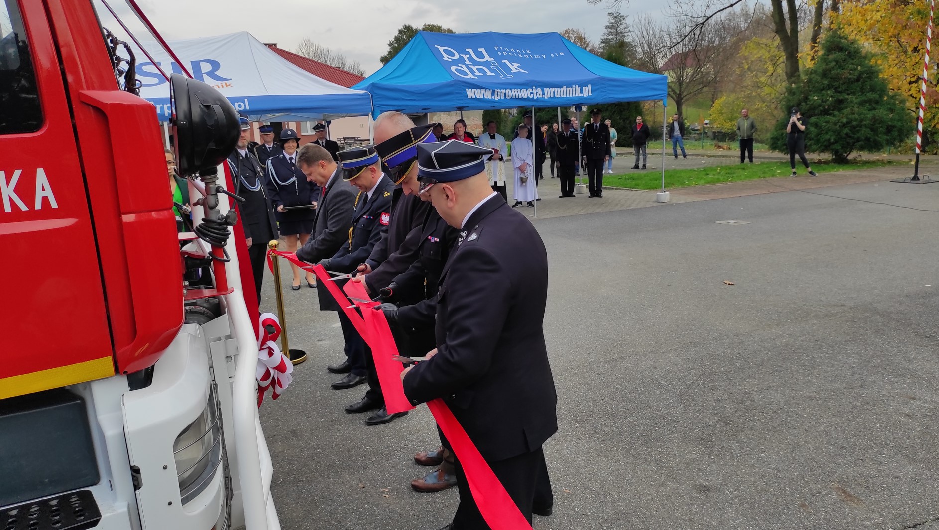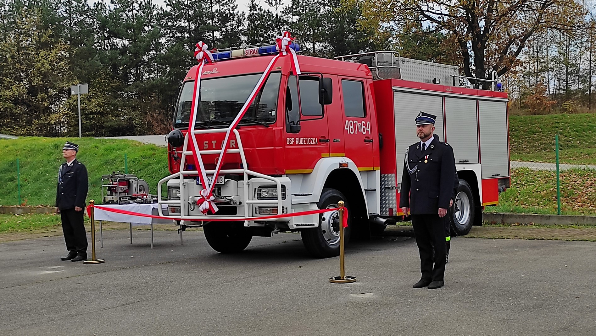 Po odczytaniu aktów przekazania średniego samochodu ratowniczo gaśniczego dla OSP Rudziczka oraz hydraulicznego zestawu ratowniczego dla OSP w Szybowicach nastąpiło wręczenie kluczyków oraz aktów przekazania. Następnie przecięcia wstęgi oraz poświęcenia samochodu i sprzętu hydraulicznego dokonali przybyli na uroczystość goście.