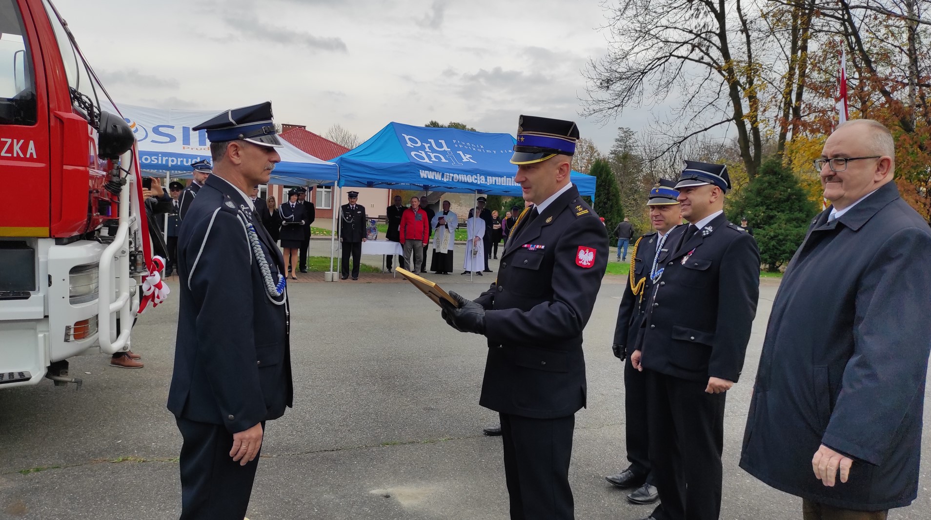 Uroczysty apel z okazji przekazania i poświecenia średniego samochodu ratowniczo-gaśniczego dla OSP w Rudziczce oraz hydraulicznego zestawu ratowniczego dla OSP w Szybowicach