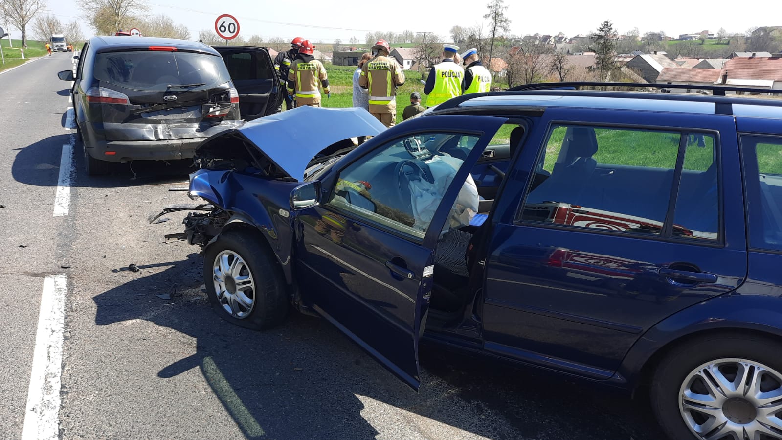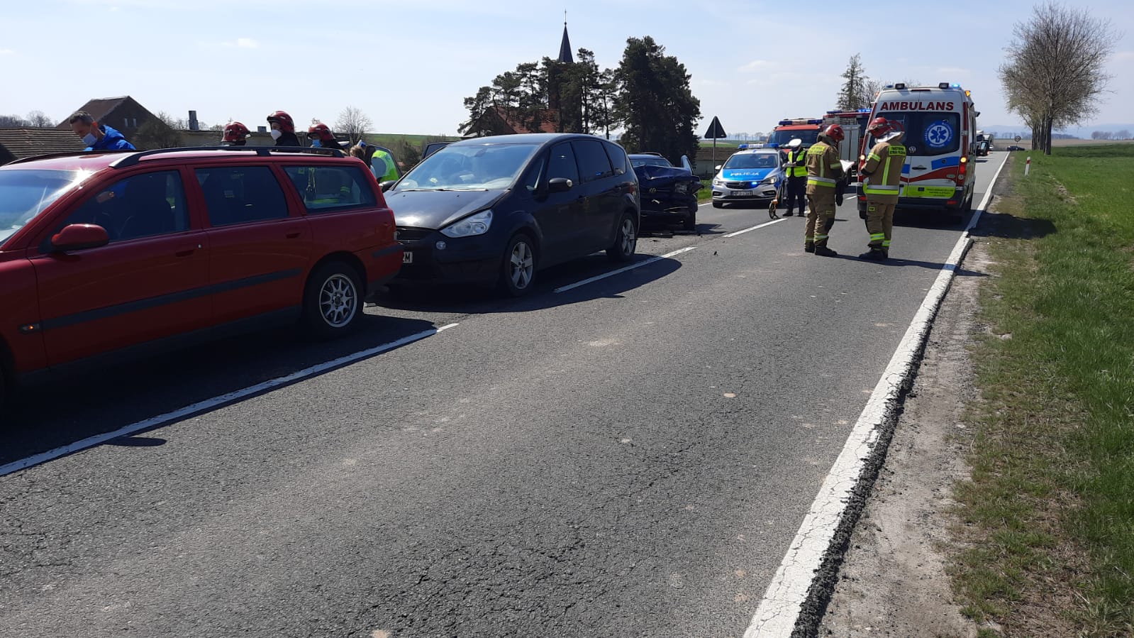 Po przybyciu na miejsce zdarzenia kierujący działaniem ratowniczym w wyniku rozpoznania stwierdził, że na drodze krajowej doszło do uszkodzenia czterech samochodów osobowych stojacych na jednym pasie jezdni (jeden za drugim). W zdarzeniu uczestniczyło łącznie 8 osób, w tym 3 dzieci. Wszystkie osoby opuściły pojazdy o własnych siłach przed przybyciem jednostek ochrony przeciwpożarowej.