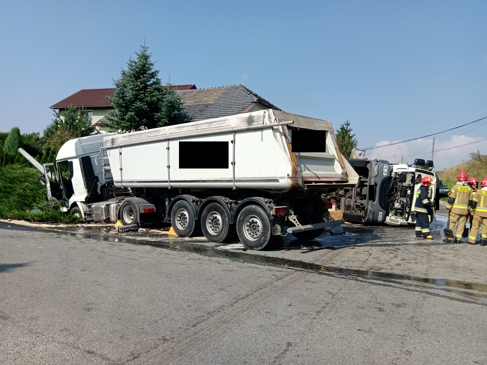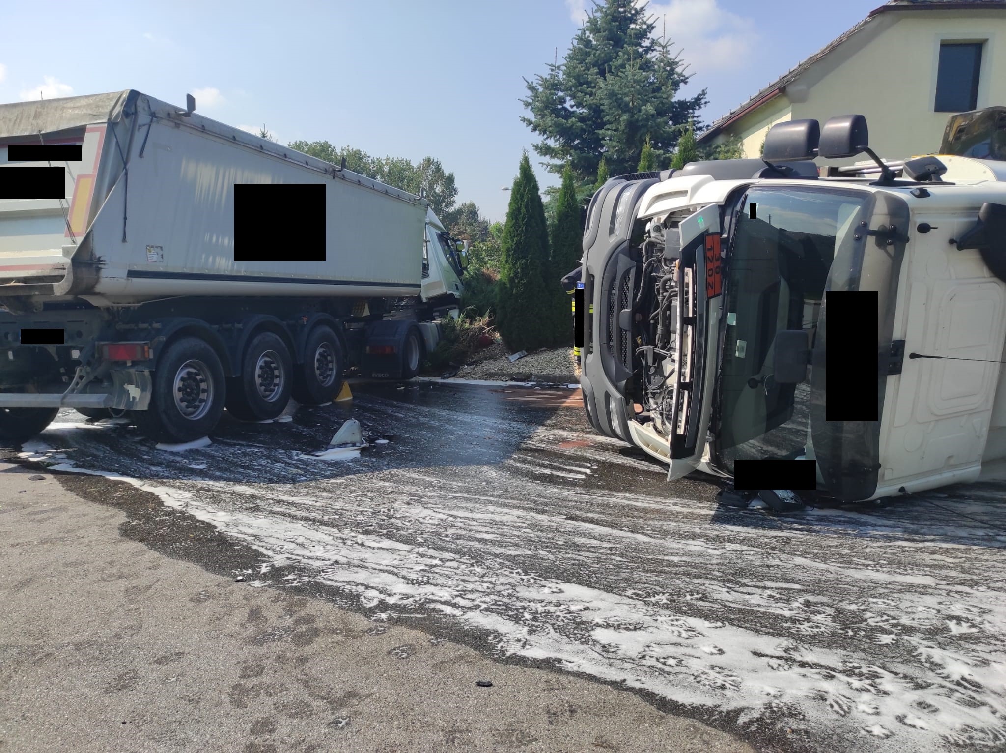 Po przybyciu na miejsce zdarzenia kierujący działaniem ratowniczym w wyniku rozpoznania stwierdził, że na drodze powiatowej doszło zderzenia dwóch samochodów ciężarowych (ciągnika siodłowego z naczepą i cysterny do przewozu paliwa). W wyniku zderzenia ciągnik siodłowy zjechał do pobliskiego rowu a cysterna przewróciła się na bok.