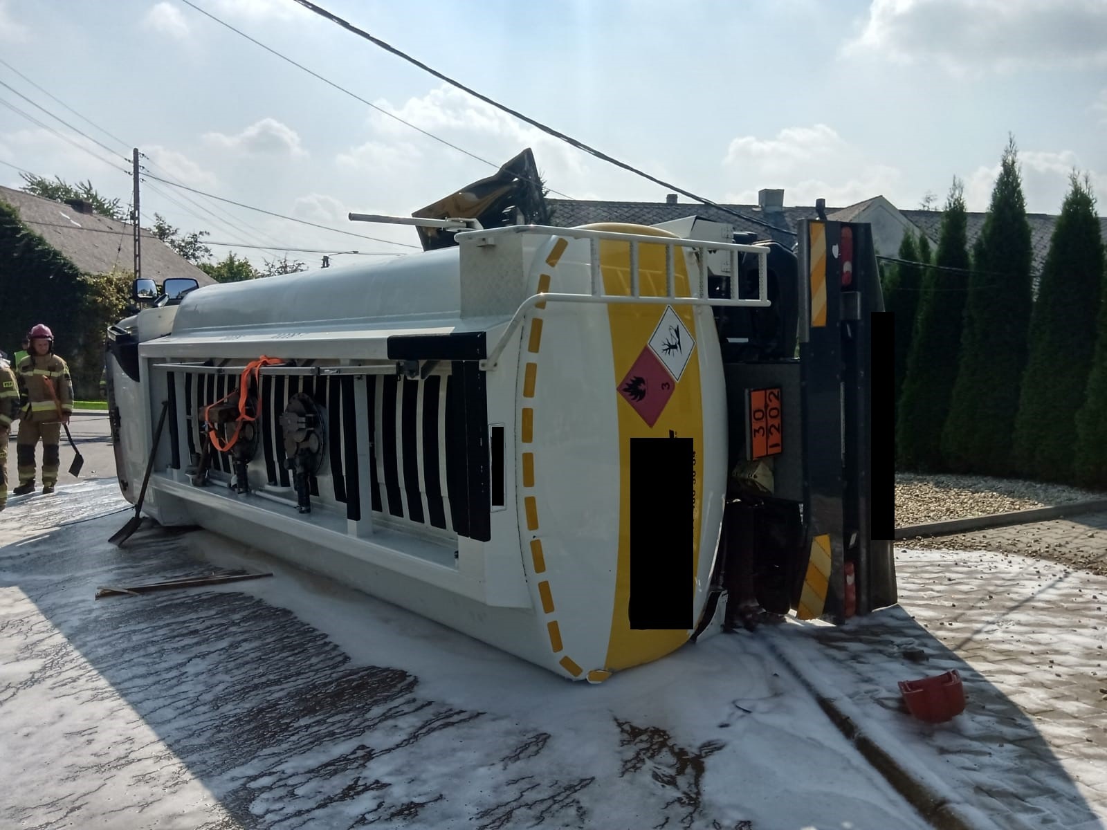 Przedstawiciele zakładu energetycznego odłączyli zasilanie w uszkodzonej napowietrznej linii energetycznej a następnie usunęli zwisające nad przewróconą cysterną przewody.