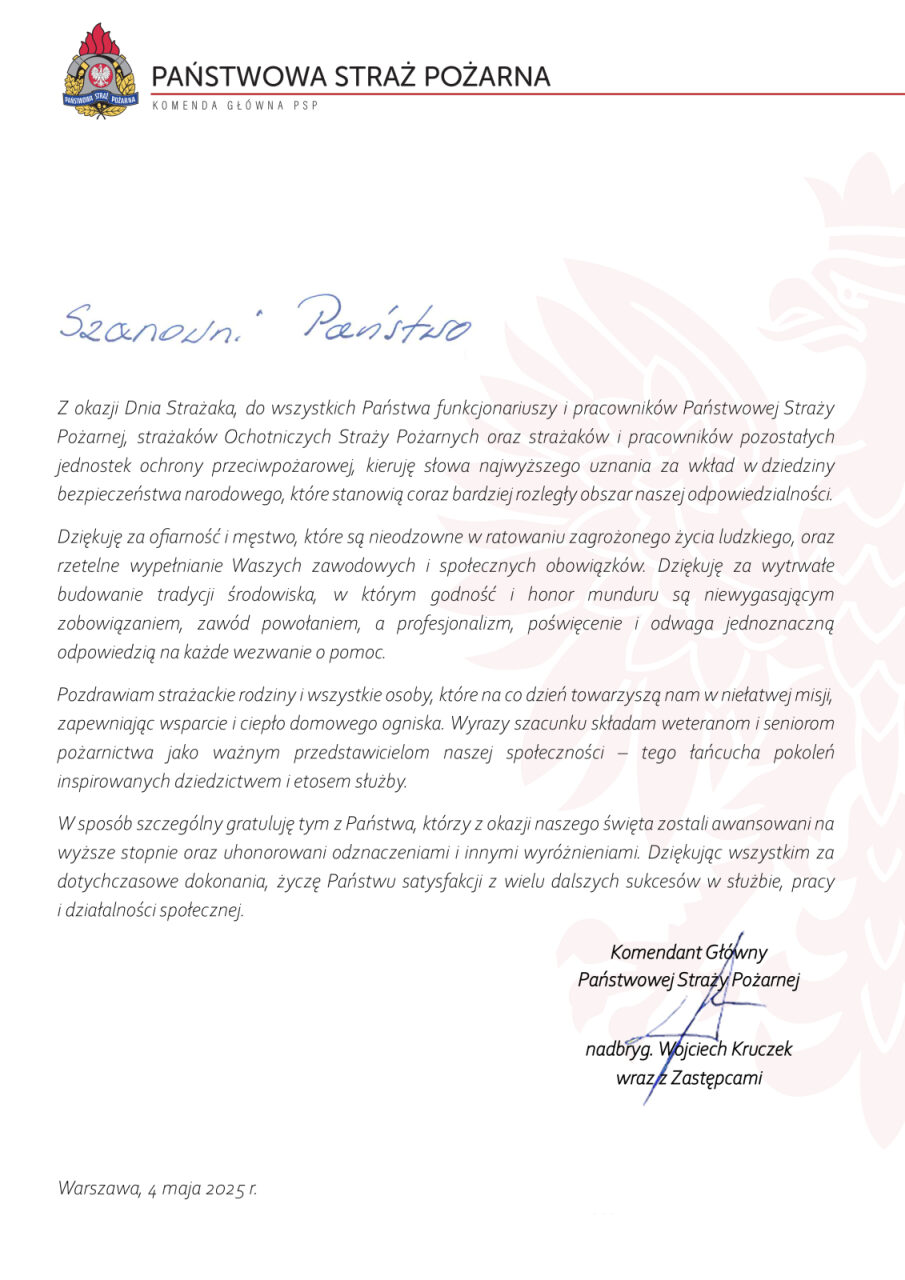 Na zdjęciu widnieje napis: Życzenia Komendanta Głównego z okazji Dnia Strażaka oraz logotyp Państwowej Straży Pożarnej