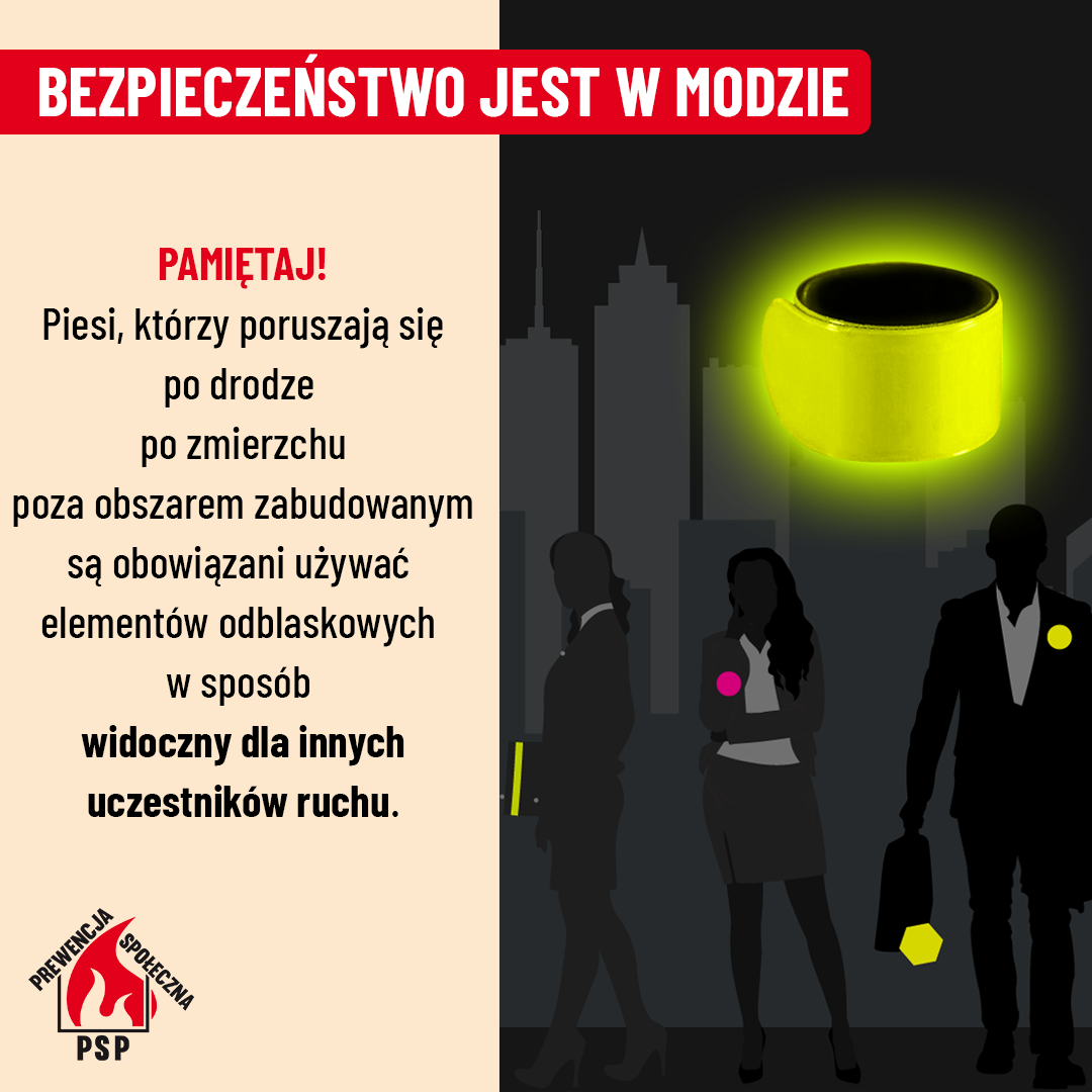 Piesi, którzy poruszają się po drodze po zmierzchu poza obszarem zabudowanym są zobowiązani używać elementów odblaskowych w sposób widoczny dla innych uczestników ruchu.