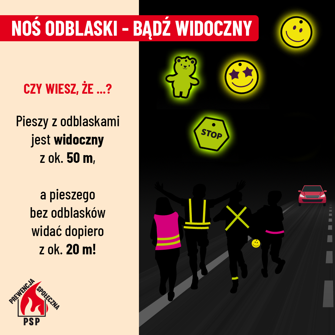 Pieszy z odblaskiem jest widoczny z ok. 150 m, a pieszego bez odblasków widać dopiero z ok. 20 m!